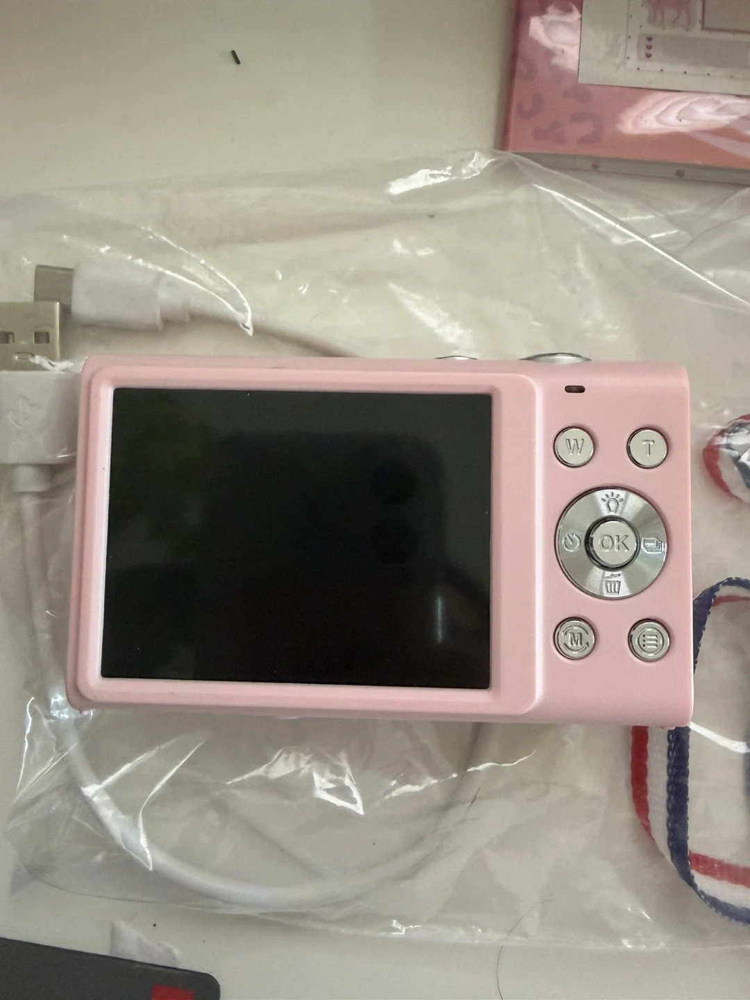 This is a pink digital camera with 48.0 megapixels and 16x powerful zoom. It supports 4K video recording and comes with a USB charging cable. It's great for capturing clear photos and videos!