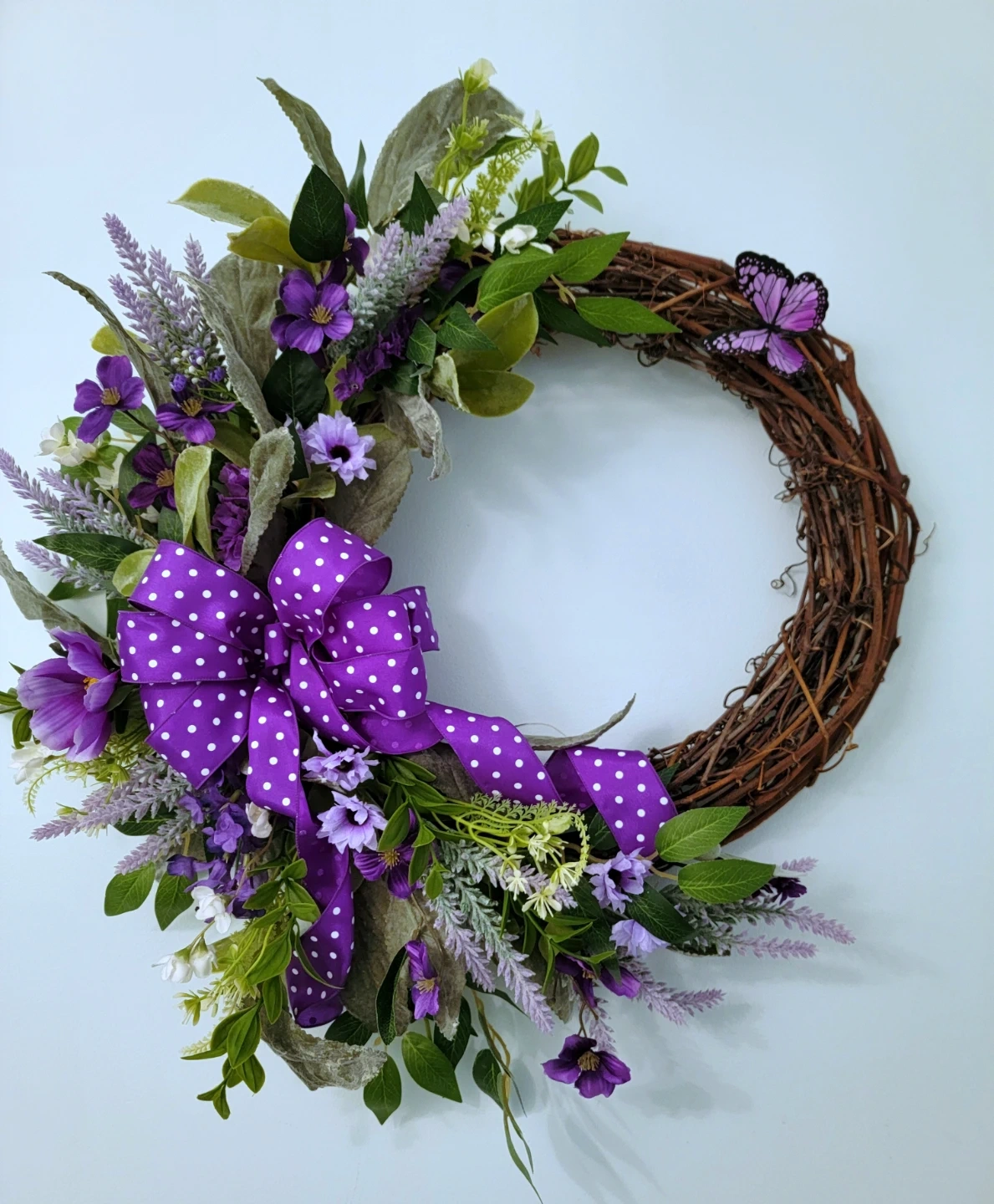 Pretty artificial lavender and floral wreath. It's adorned with a ribbon bow and a decorative butterfly. This wreath is a lovely accent for any door or wall! Two wreaths can be sold individually or bundle 30 each