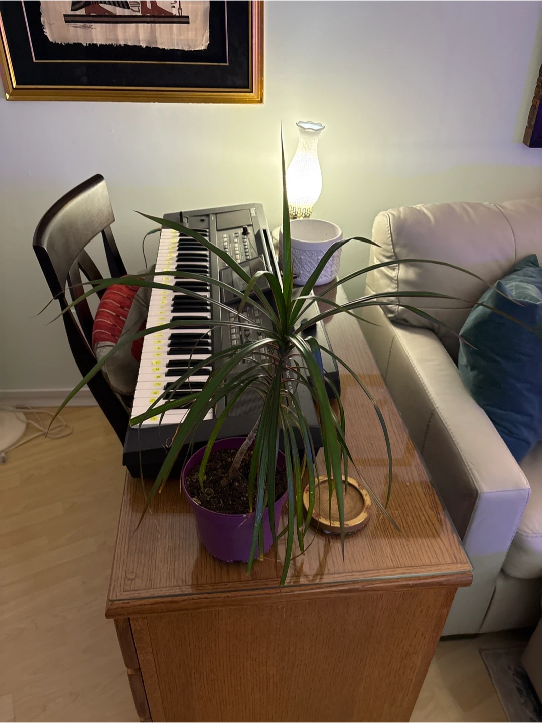 This is a healthy Dracaena plant potted in a vibrant purple container. It's a lovely addition to any indoor space, bringing a touch of greenery. The plant comes as shown in the photos.