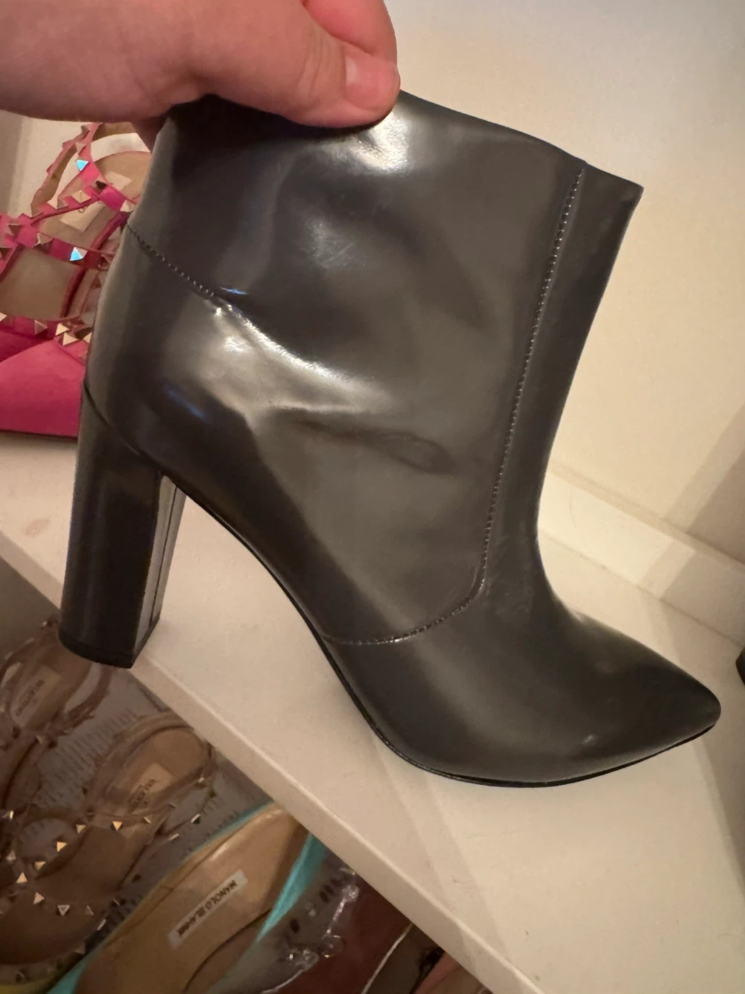 Shiny dark grey Jil Sander Navy ankle boots. Pointed toe with a block heel. Includes original box. Size 38. retailed over $1200