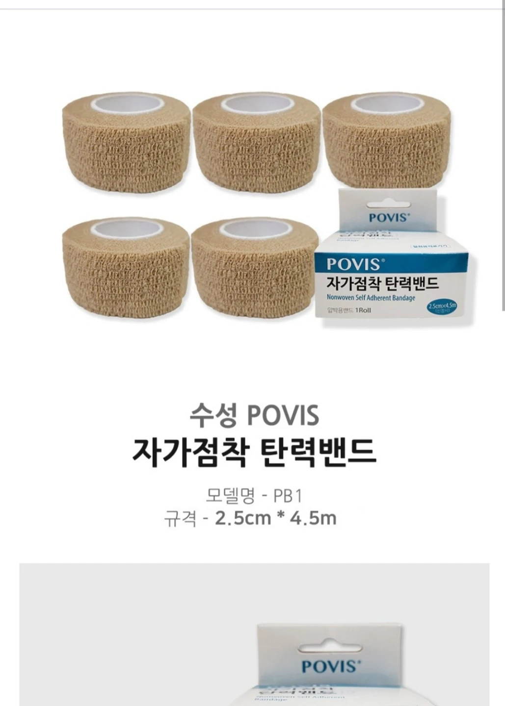 This is a POVIS nonwoven self-adherent elastic bandage. It's made of polyester material to compress or hold parts of the body. The dimensions are 2.5cm by 4.5m.