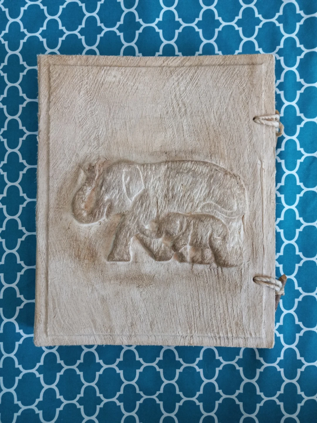 This handmade album features a beautiful elephant and calf embossed design on the cover. It's bound with rustic twine and wooden toggles, perfect for photos or journaling. The pages are a natural, textured paper, and include corner photo mounts.