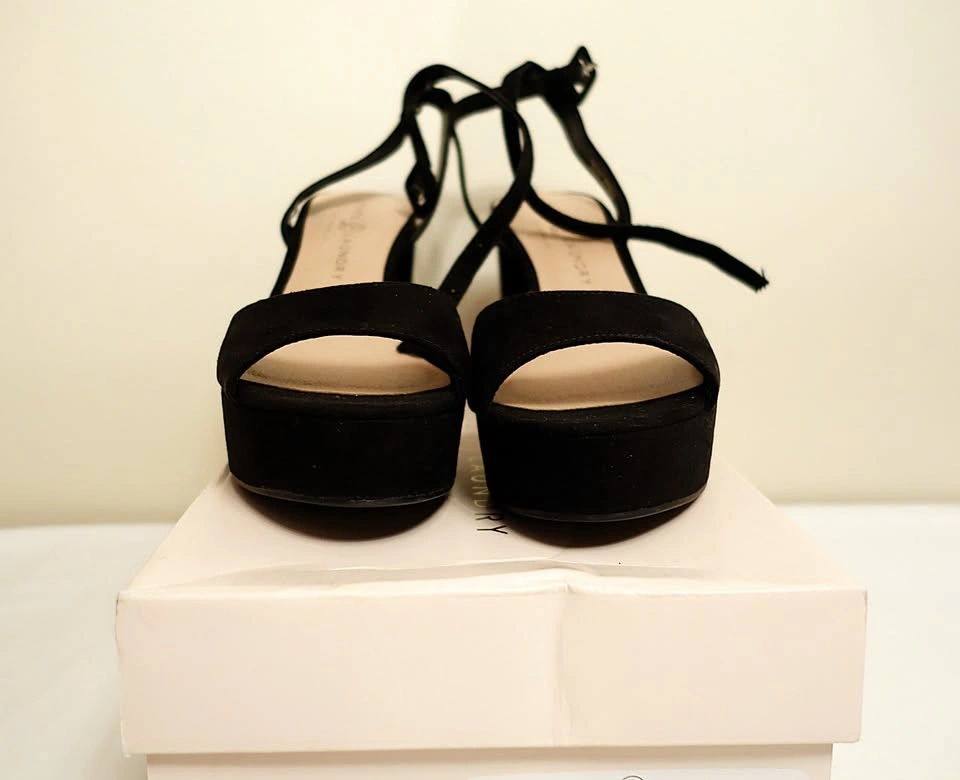 Brand new in box, never been worn. Women's size 8. Black micro suede exterior. Textile fabric. Leather sole. Block heel. 1.5 inch platform height. Suede outer material.