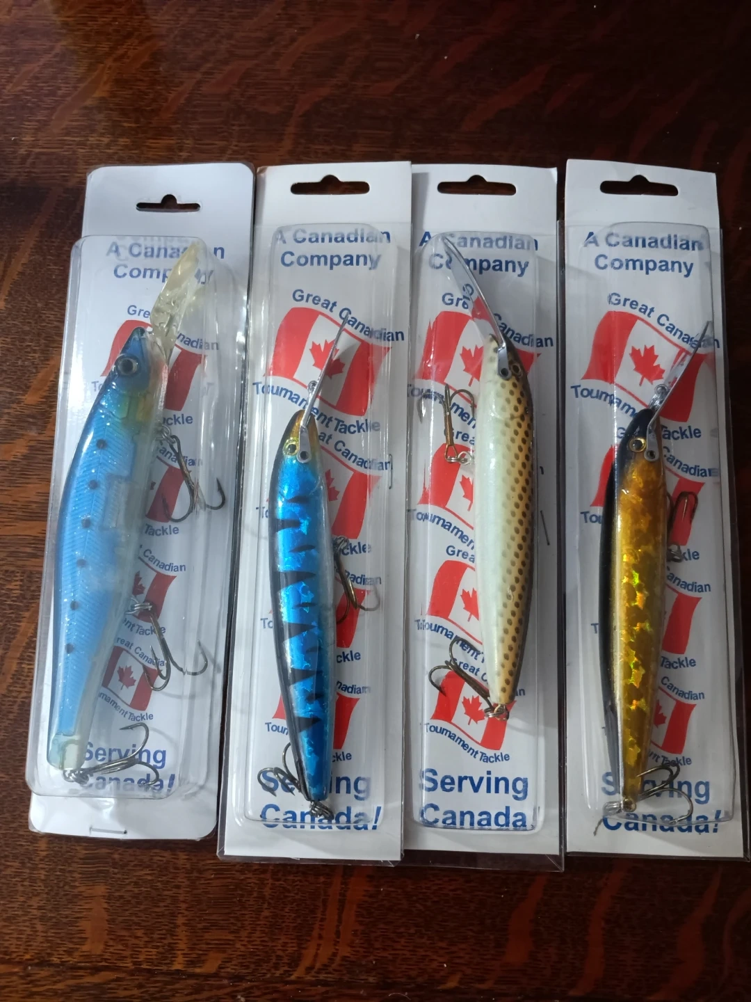 Four fishing lures from A Canadian Company, perfect for your next fishing trip. These lures come in various colours including blue, gold, and silver. Each lure is designed for effective fishing. They're ready for casting!