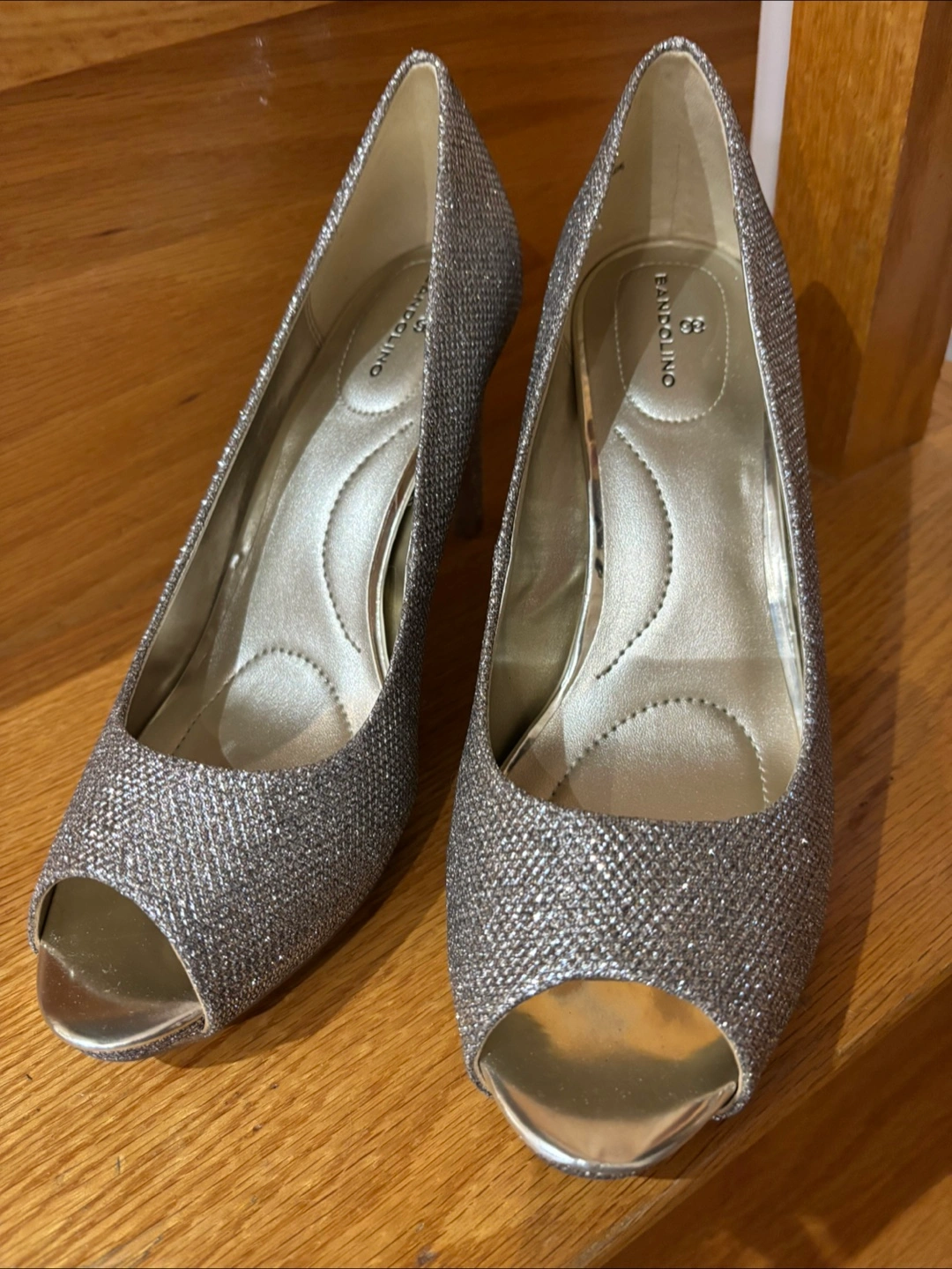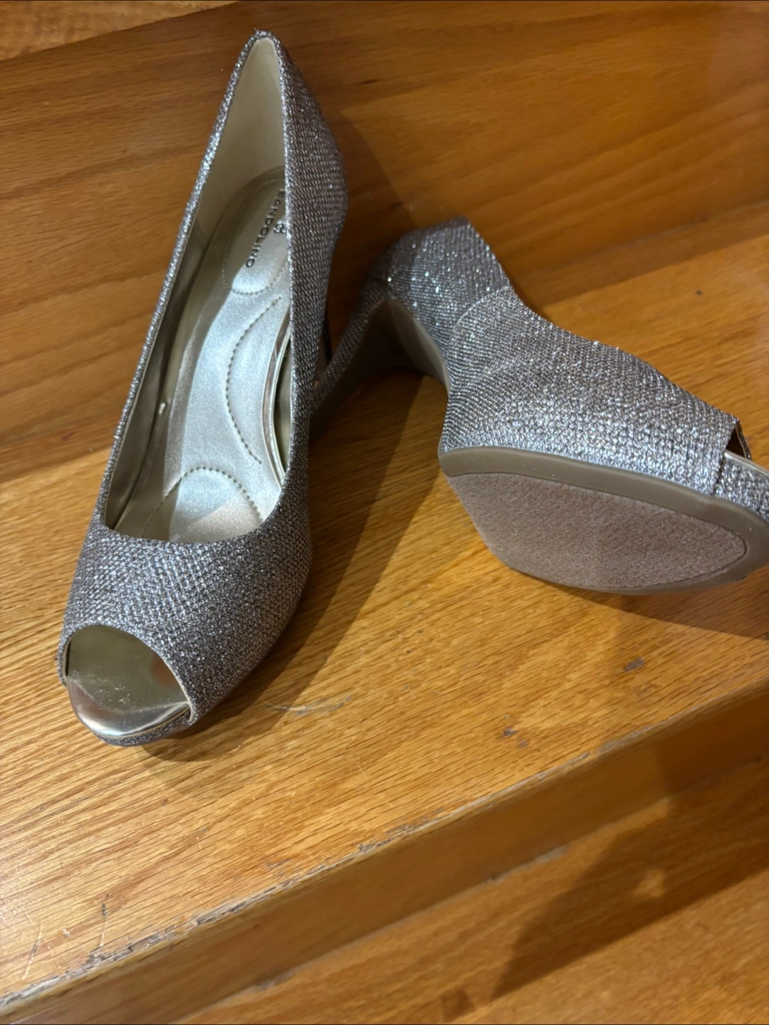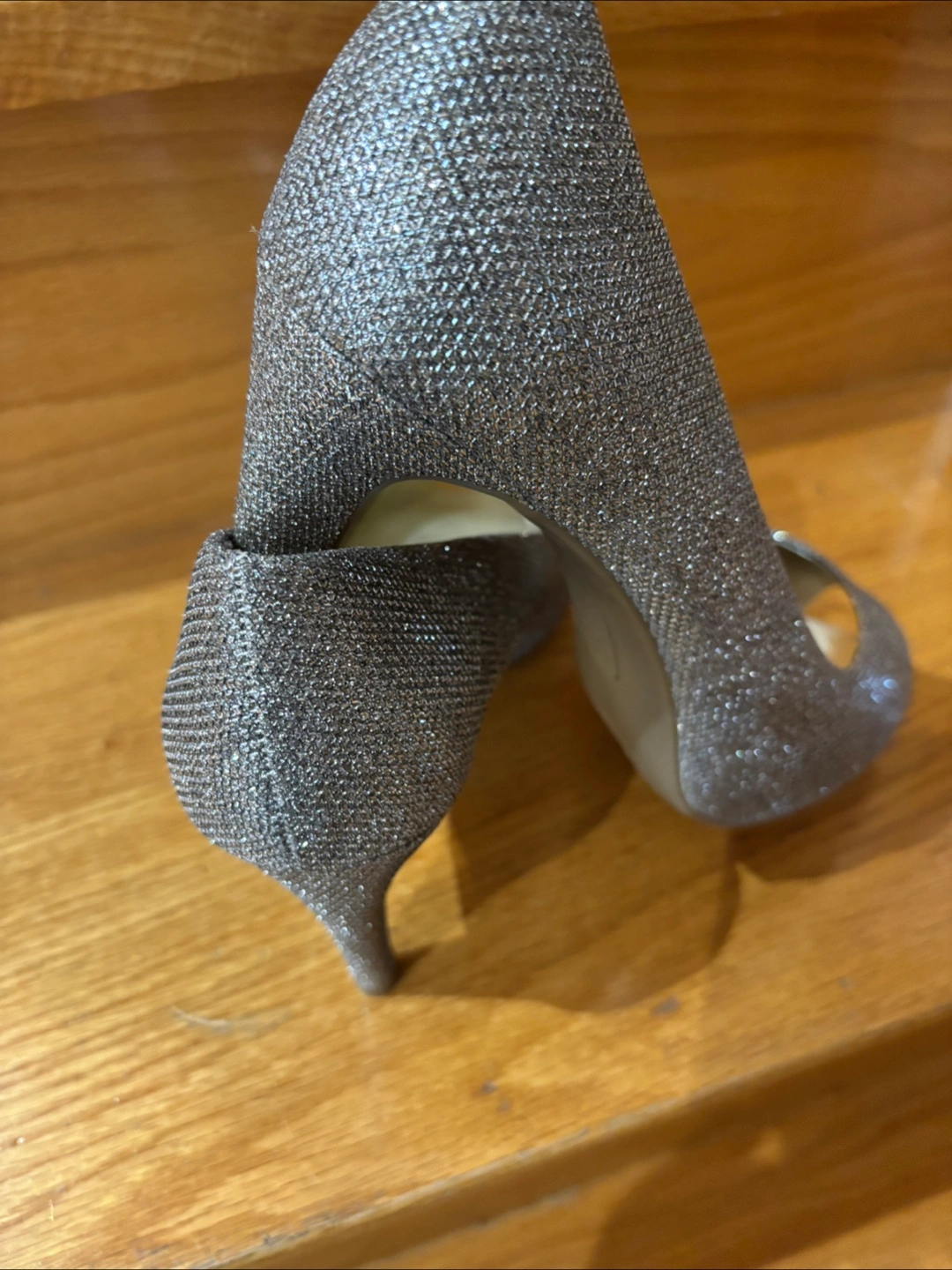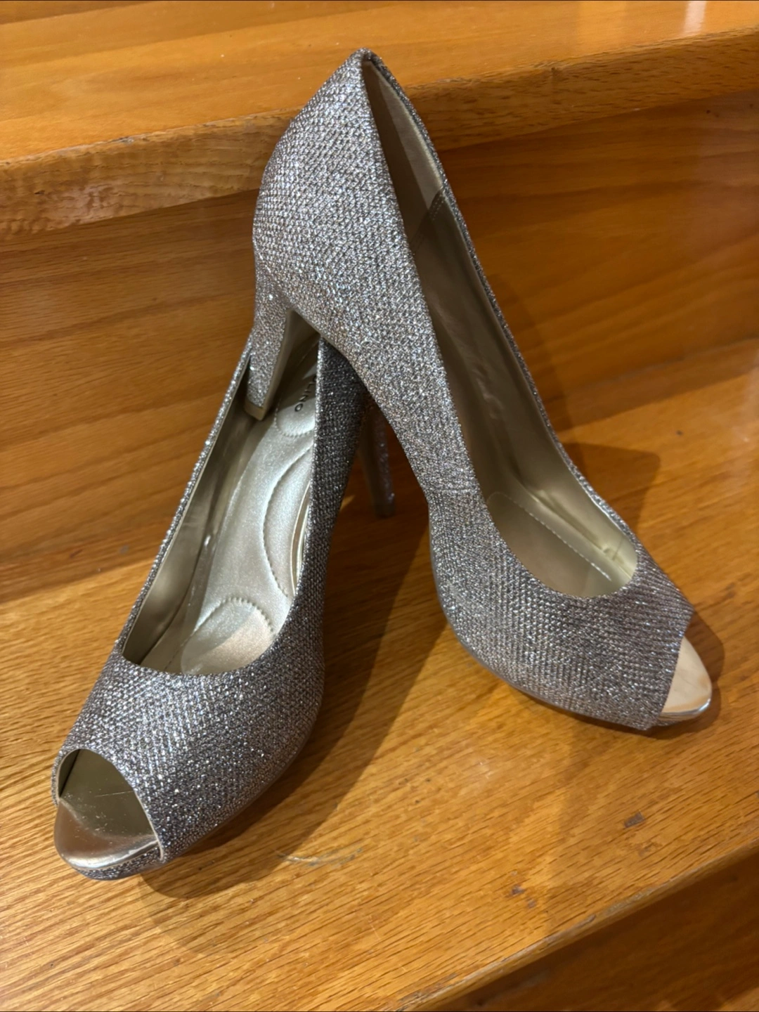 Elegant champagne-coloured platform peep-toe heels. Glitter fabric upper. Good for special occasions.