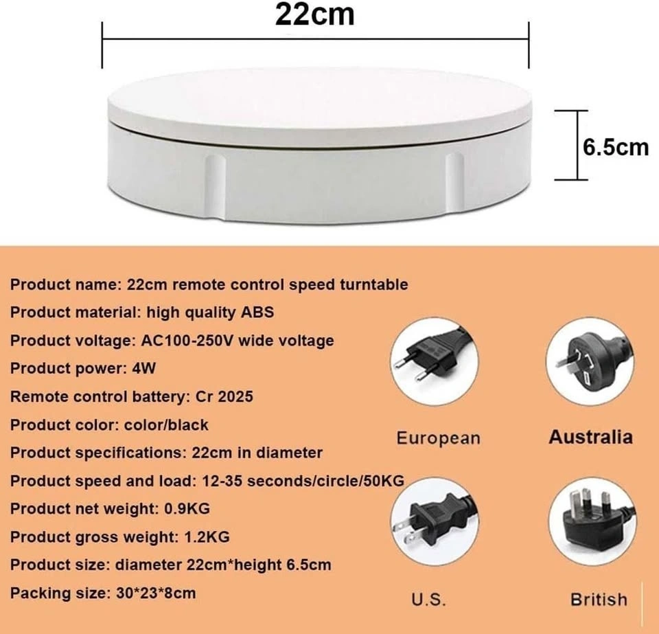 Professional electric rotating turntable for product photography and display. Perfect for creating 360° product photos and videos. Features remote control operation, smooth 360° automatic rotation, and a strong 100kg capacity. Ideal for product photography, videos, and displays. Compact 22cm platform size. Great for e-commerce sellers, photographers, collectors, and product displays. Pickup available in Toronto / GTA.