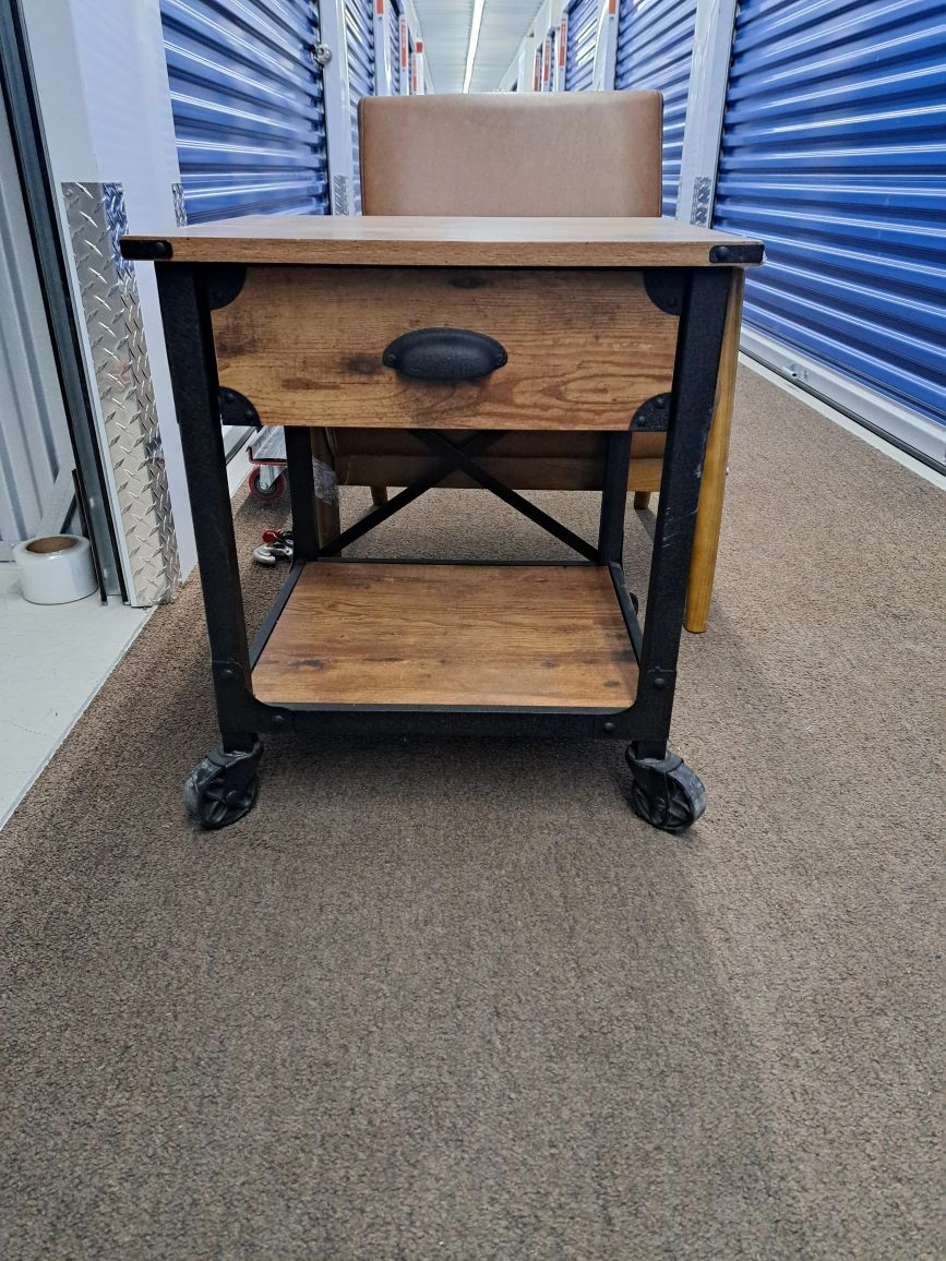This industrial-style end table is a great addition to any room. It features a drawer for storage and wheels for easy movement. The wood and metal construction gives it a sturdy and stylish look. Perfect as a nightstand or side table! Has a little scratch on the surface.