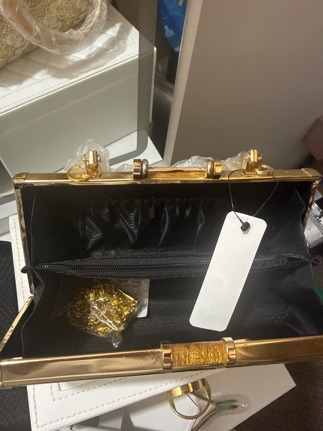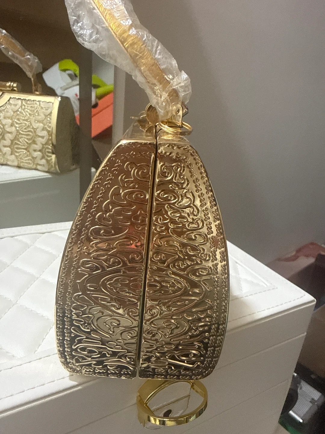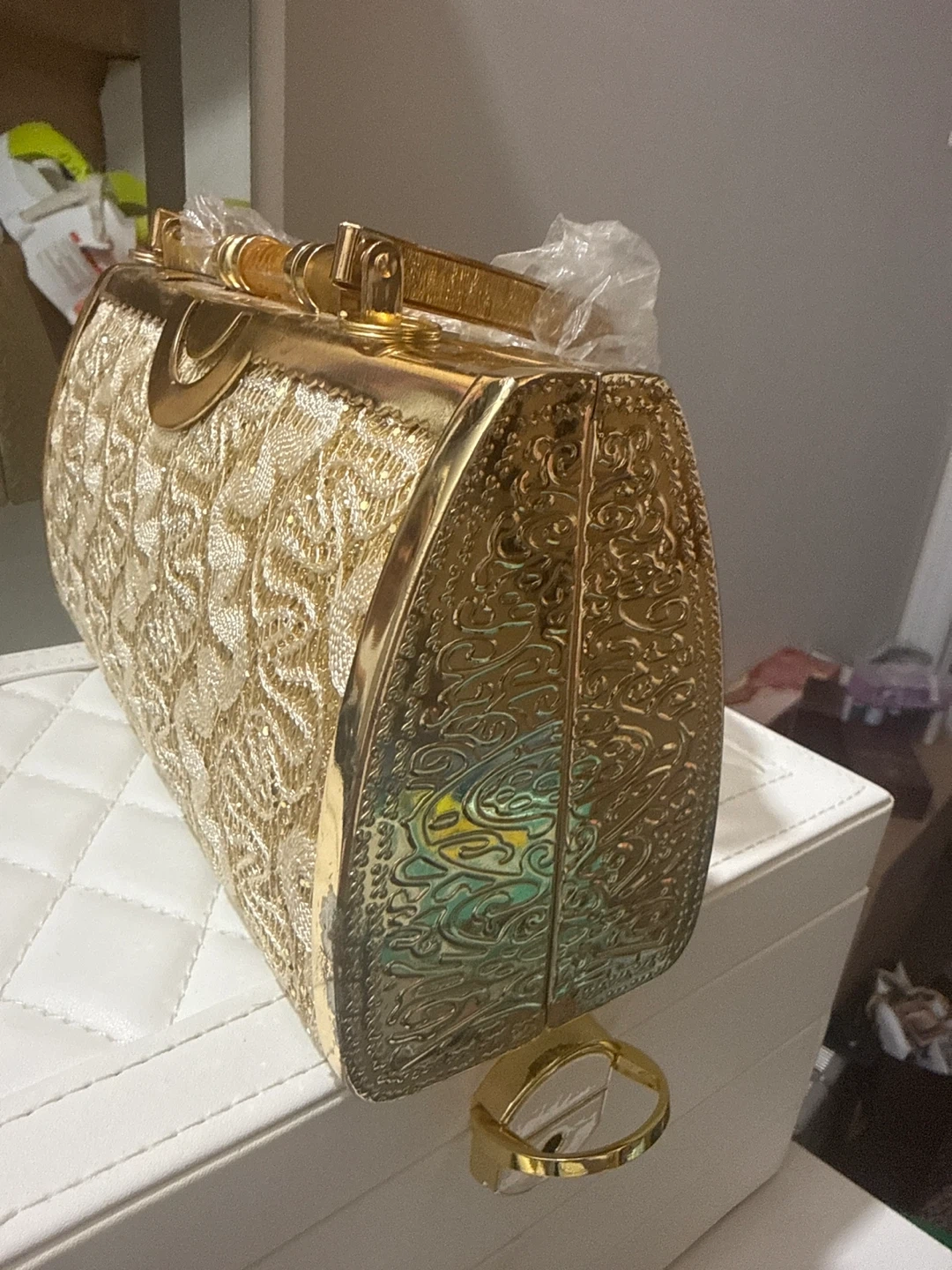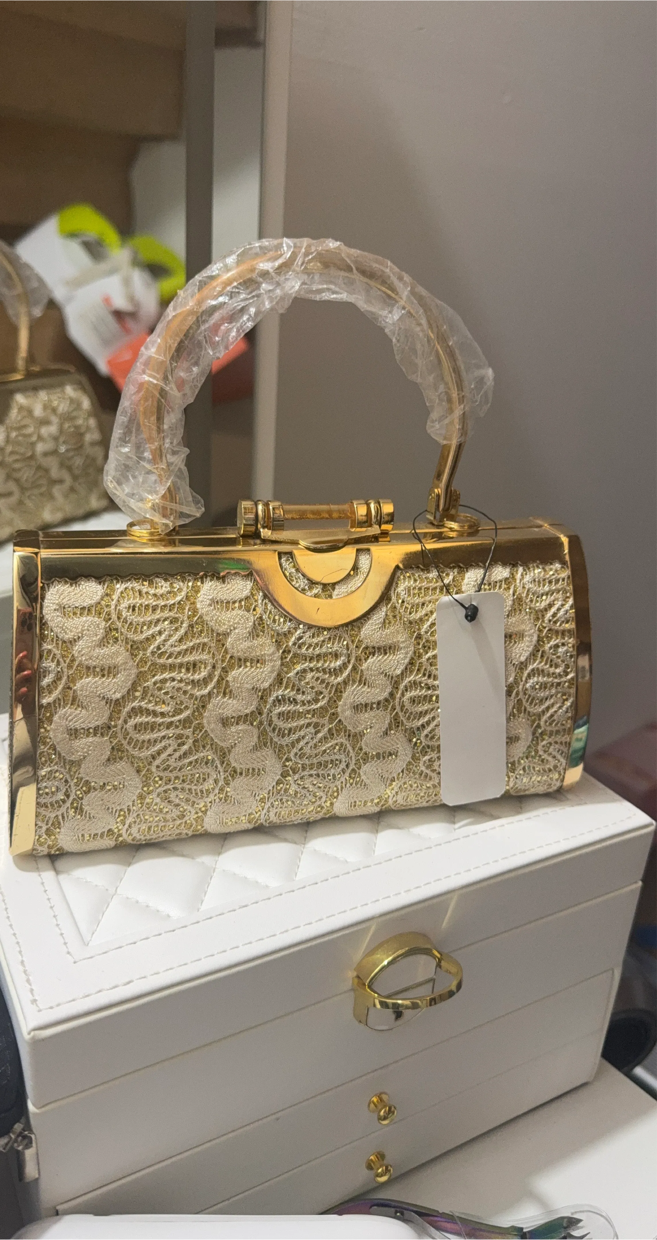 This gold clutch features a beautiful lace overlay and ornate embossed detailing on the sides. It has a secure clasp closure and a sturdy top handle, plus a detachable chain. It's perfect for formal events or a night out!