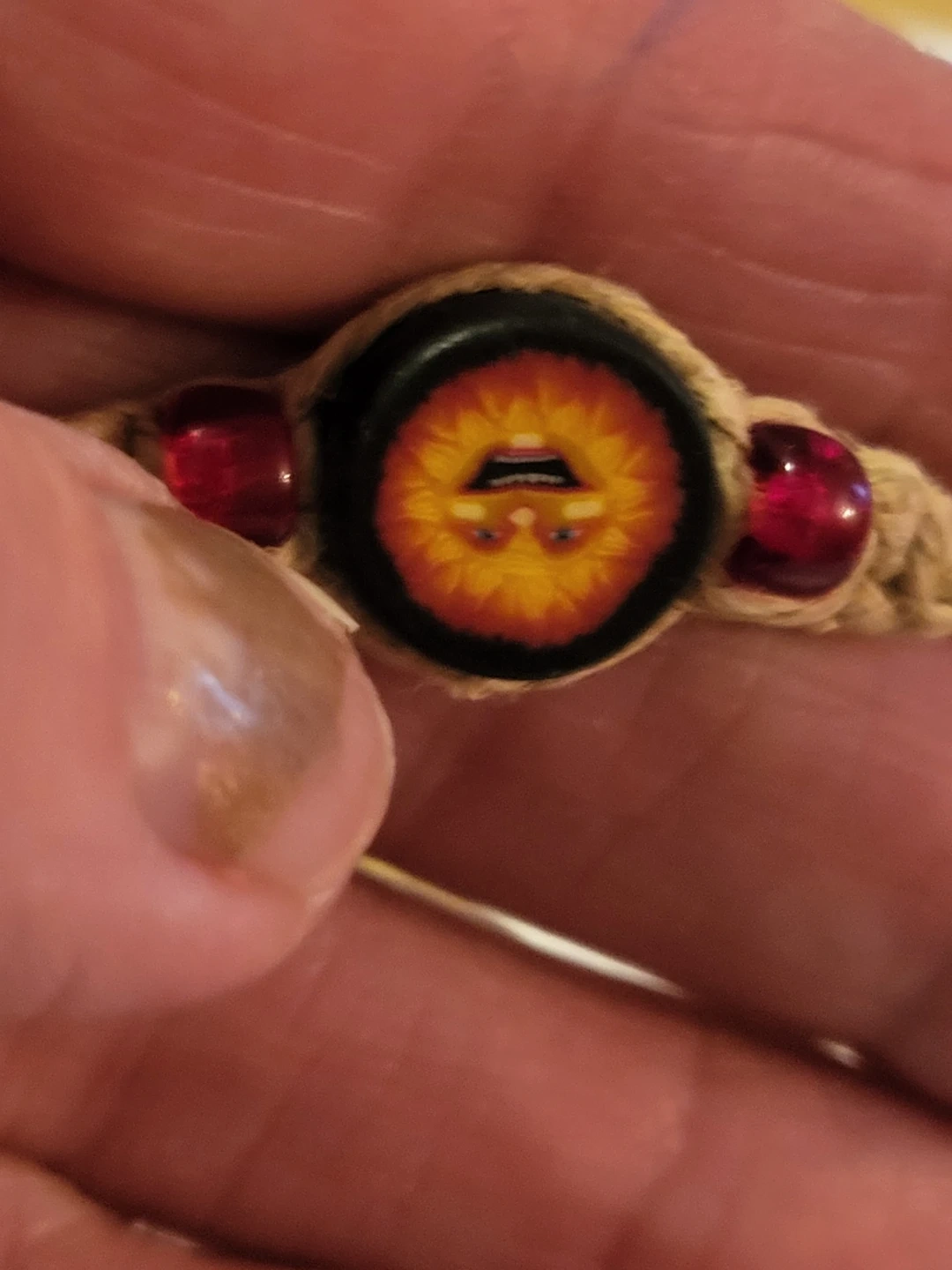 This unique bracelet is crafted from braided hemp cord and features a colourful circular charm with a smiling sun design. It's adorned with small red beads. The bracelet fastens with a metal clasp for easy wear.