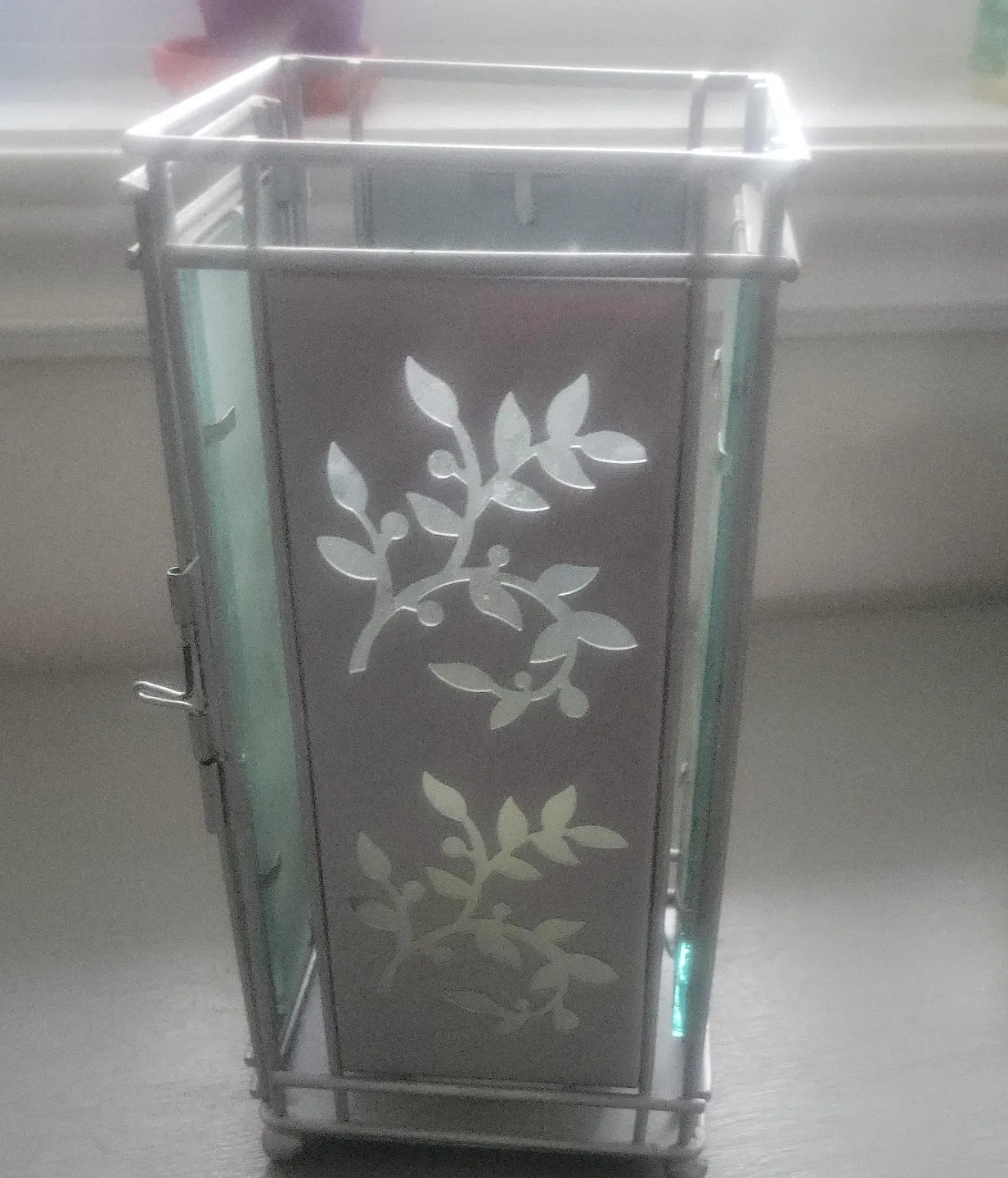 Decorative lantern with a metal frame and glass panels. It features cut-out leaf designs on the metal plates. The glass has a frosted look. A small latch is present on the side.