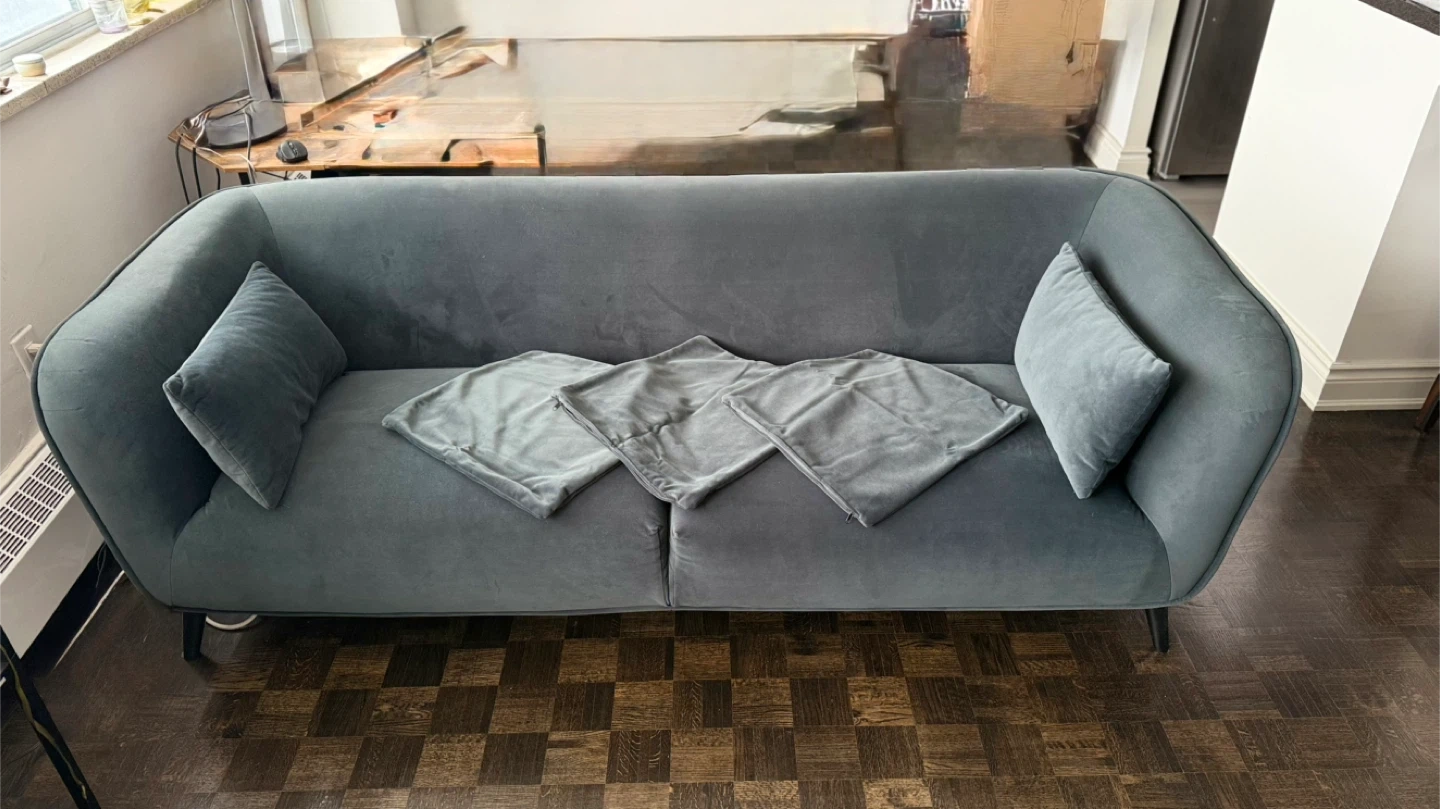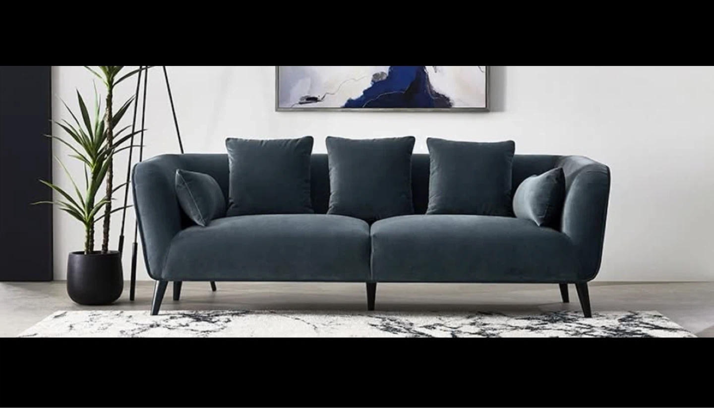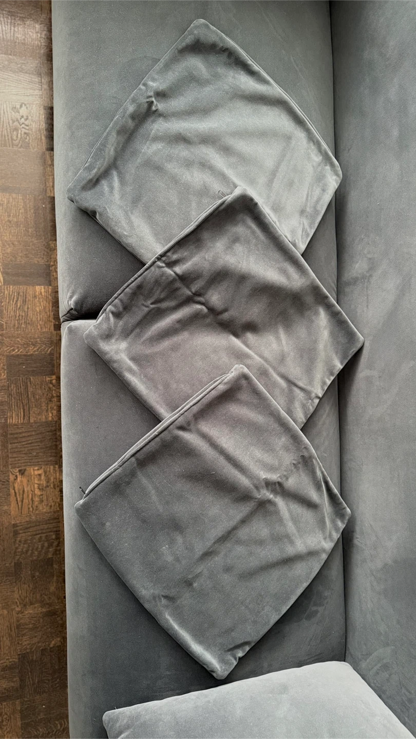 Grey Velvet Sofa with 5 Throw Pillows
