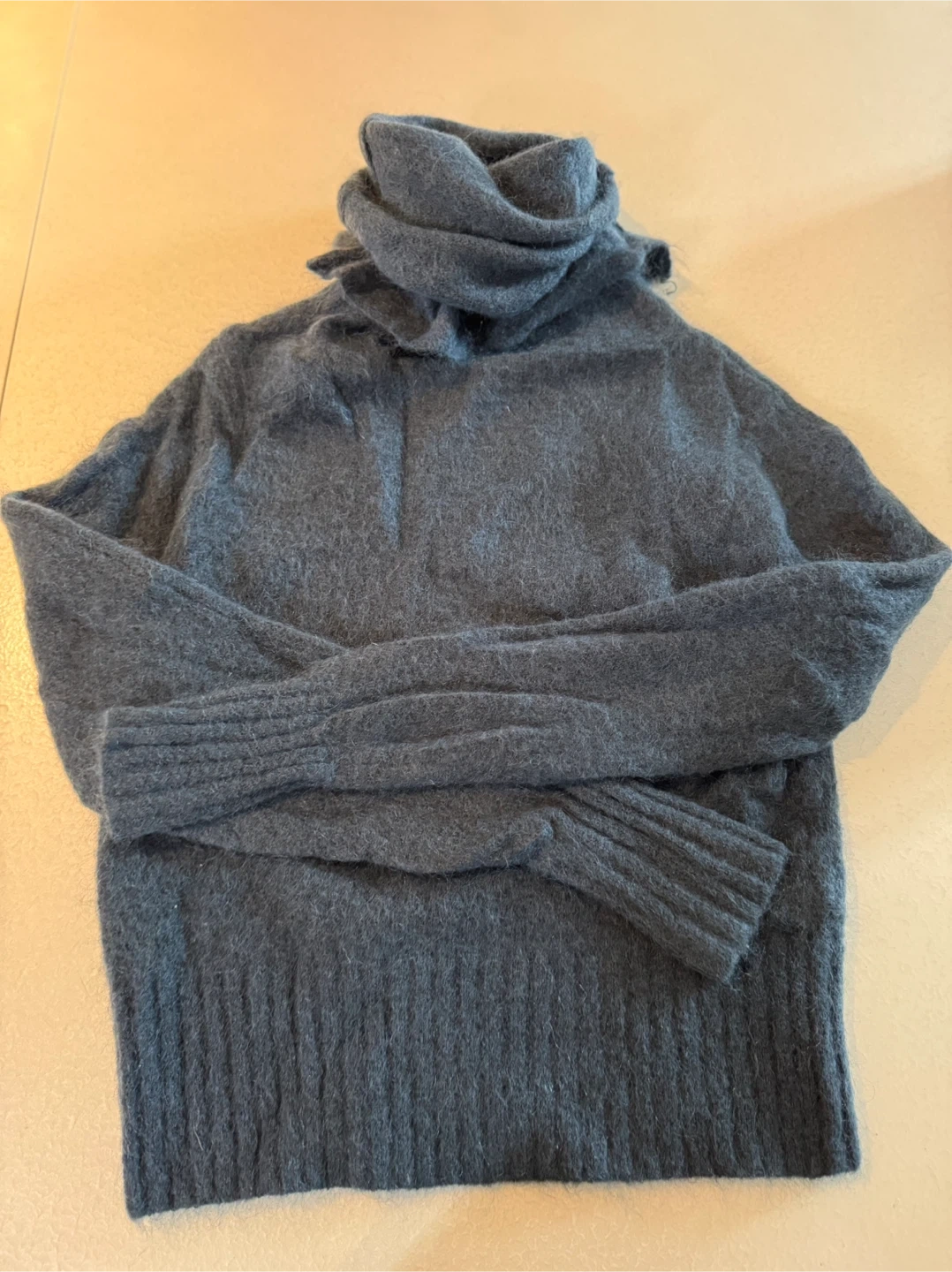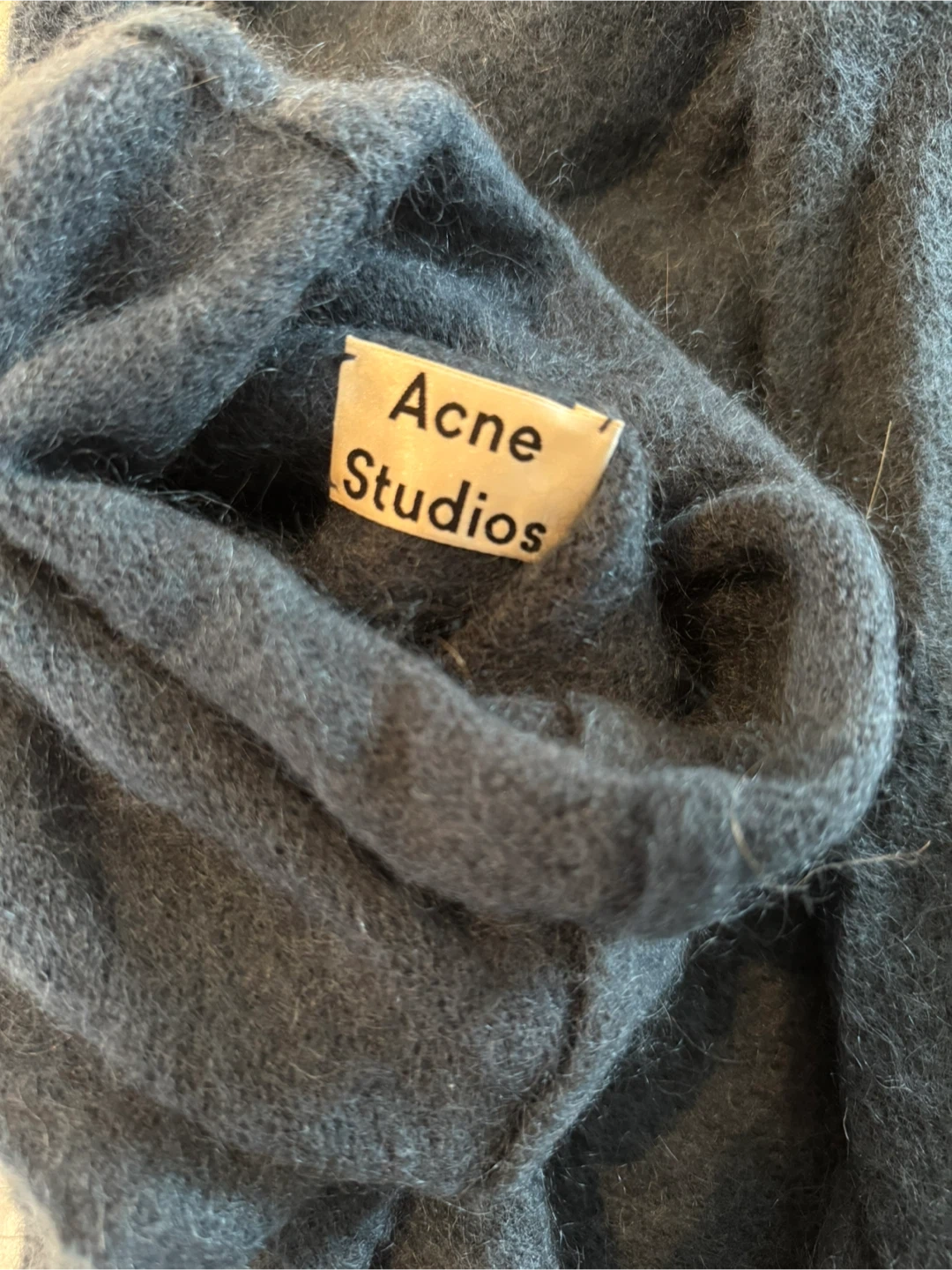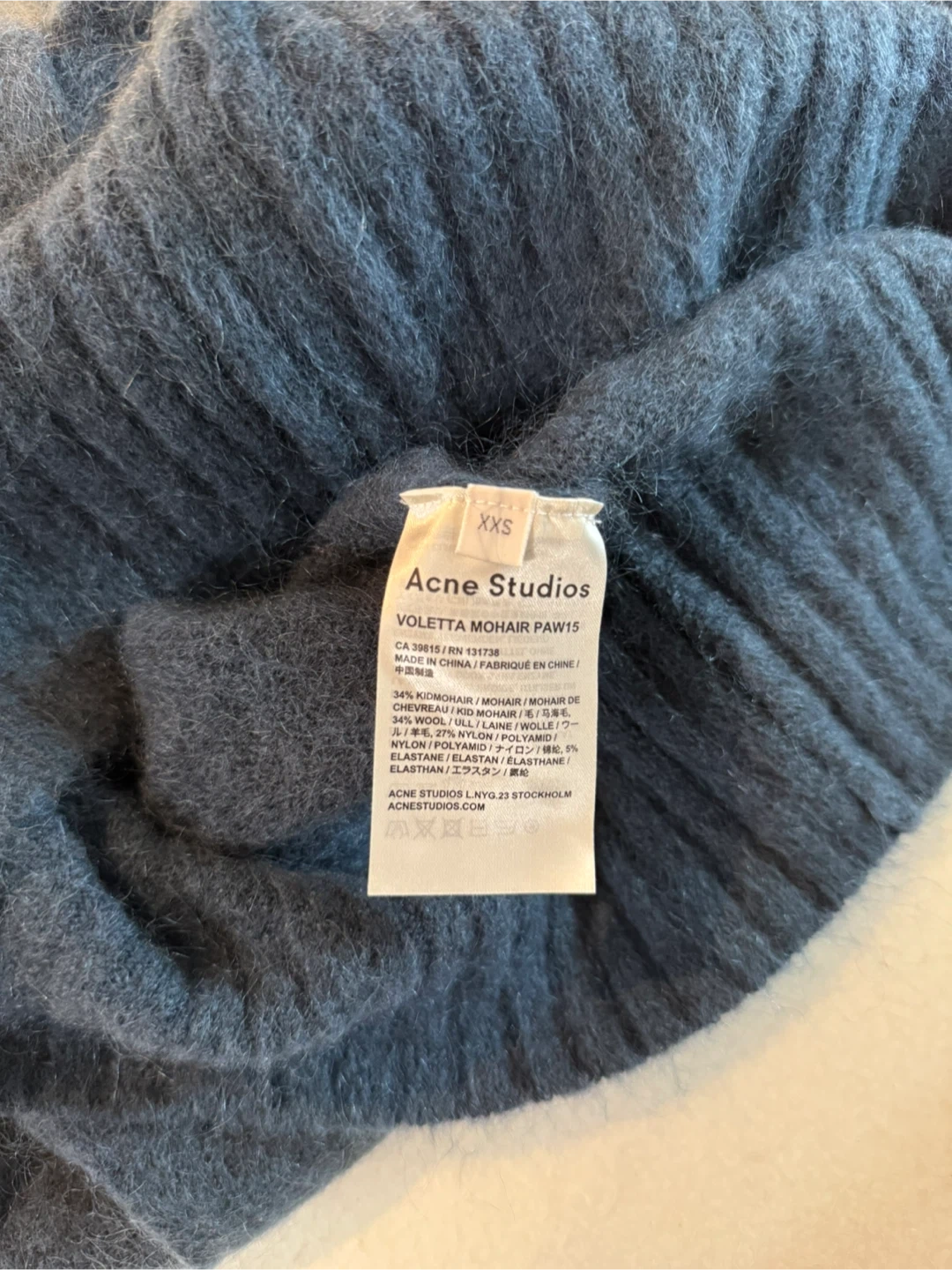 Selling an Acne Studios Voletta Mohair PAW15 turtleneck sweater. It's a size XXS and made of 34% kidmohair, 34% wool, 27% nylon, and 5% elastane.