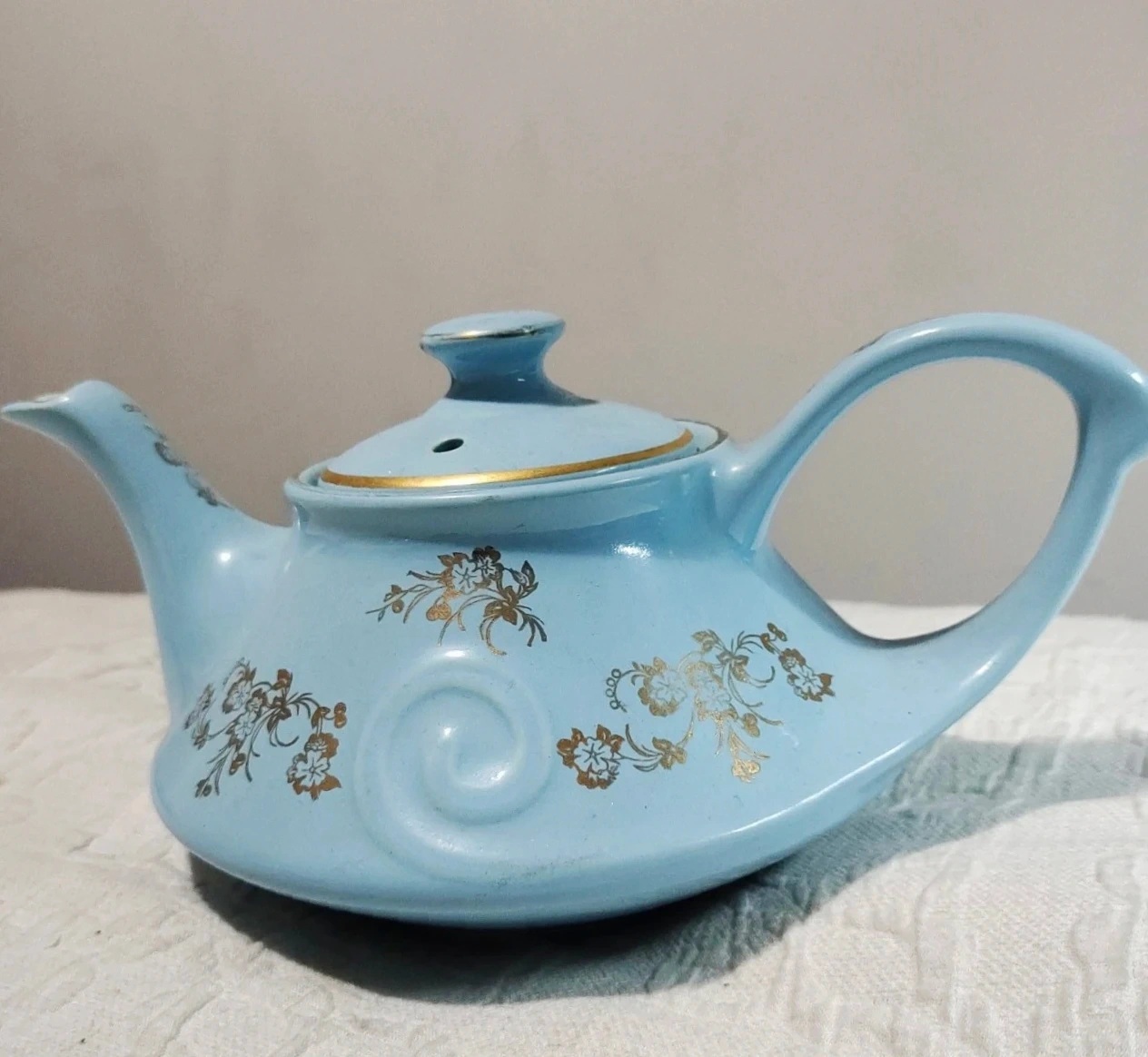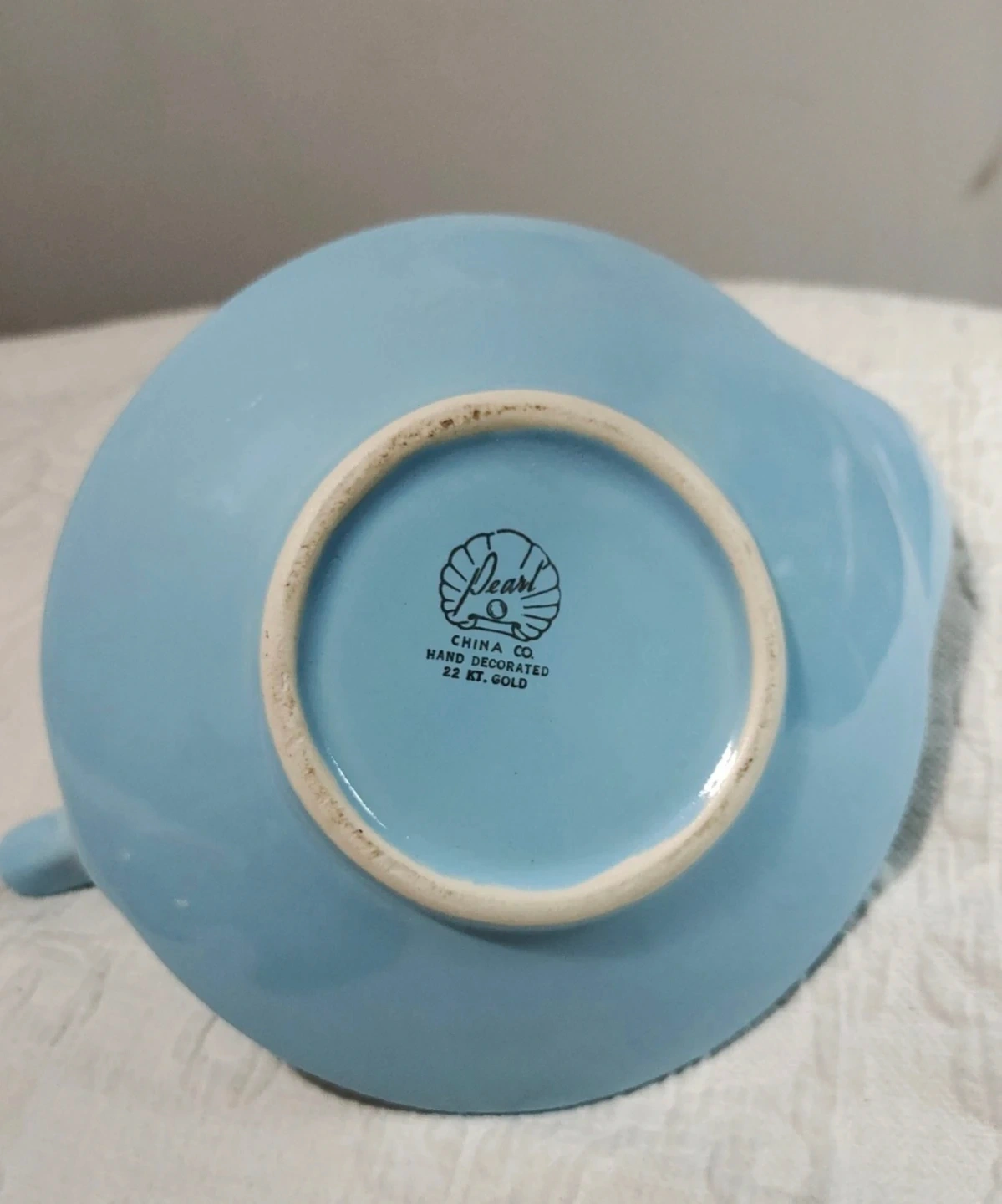 This is a lovely light blue teapot from Pearl China Co. It's hand-decorated with a delicate floral pattern and 22 kt gold accents. The teapot's design makes it a charming addition to any kitchen or tea collection.