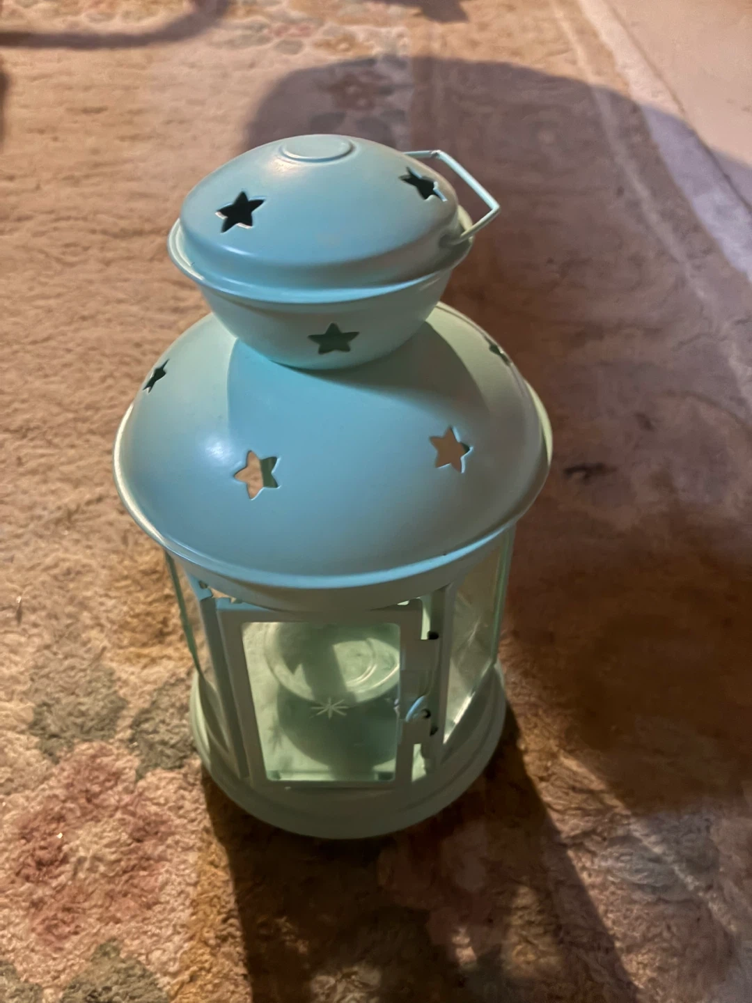 Teal metal lantern with star cutouts. It has glass panels and a metal handle. Perfect for accent lighting or decor!