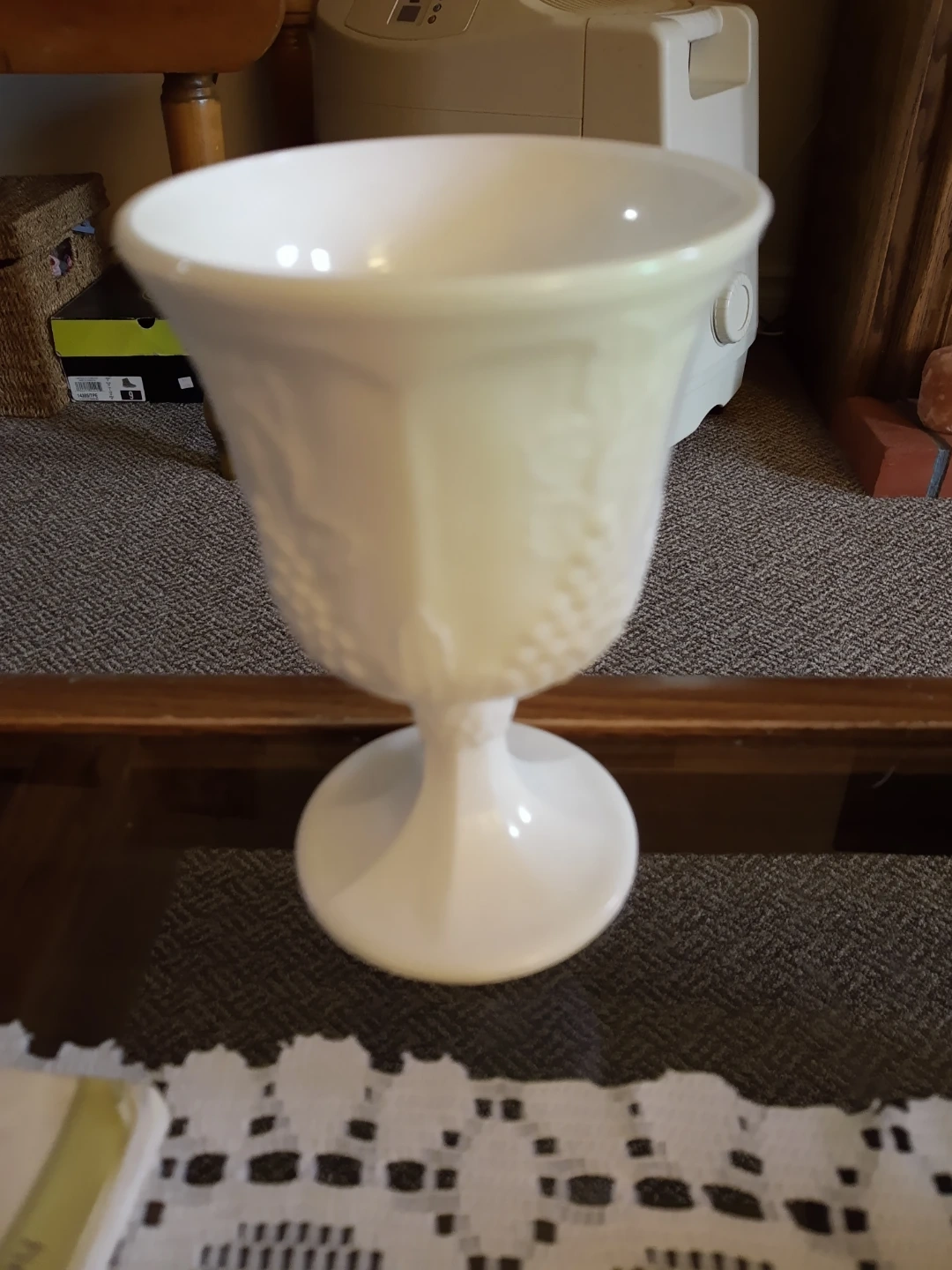 This white milk glass goblet features an embossed grape vine pattern. It's mounted on a pedestal base. A lovely decorative piece for display!