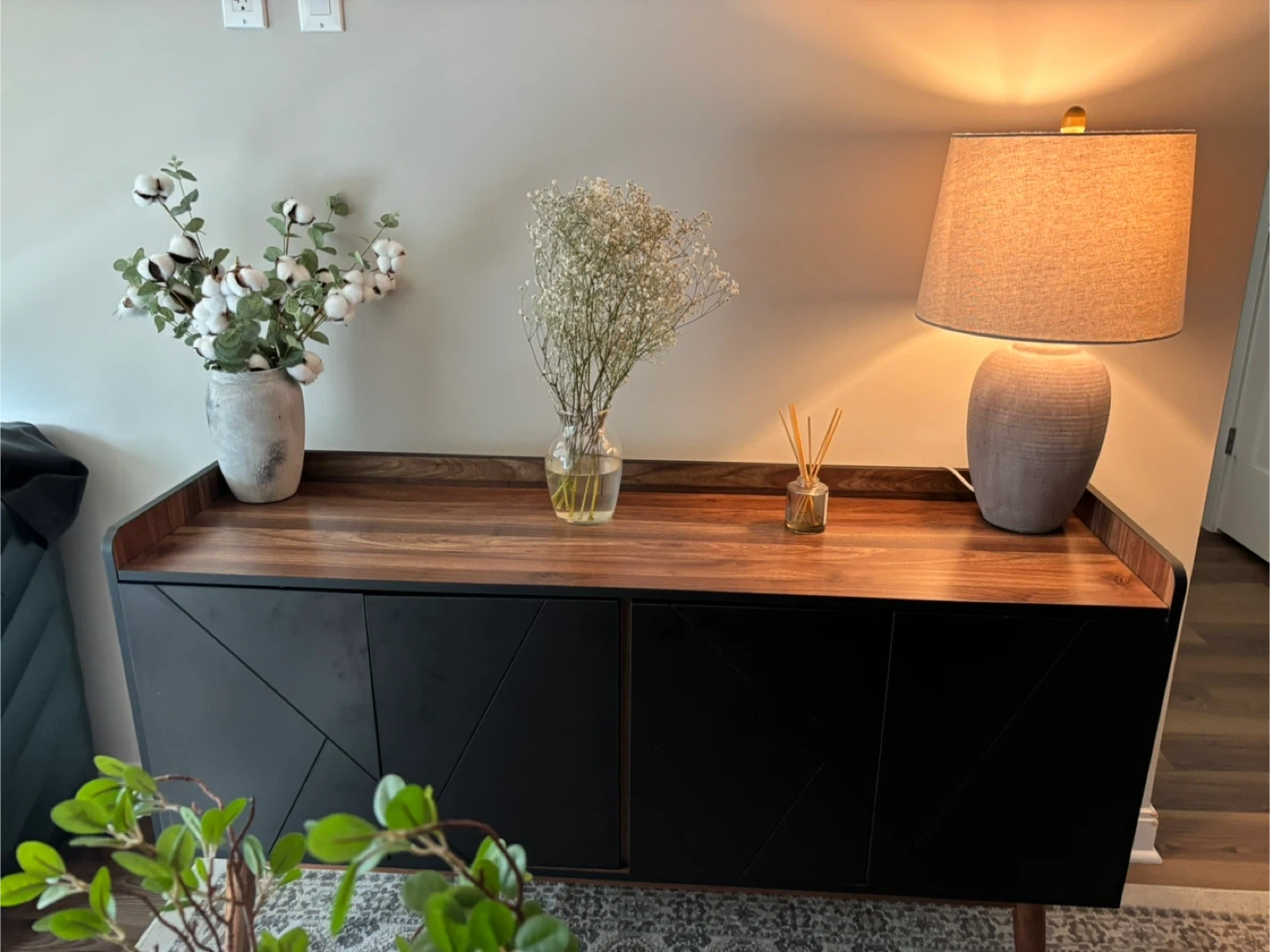 This sideboard features a sleek black finish with a modern geometric door design. It has a warm wood-grain top and tapered wooden legs. Plenty of storage behind the four doors!