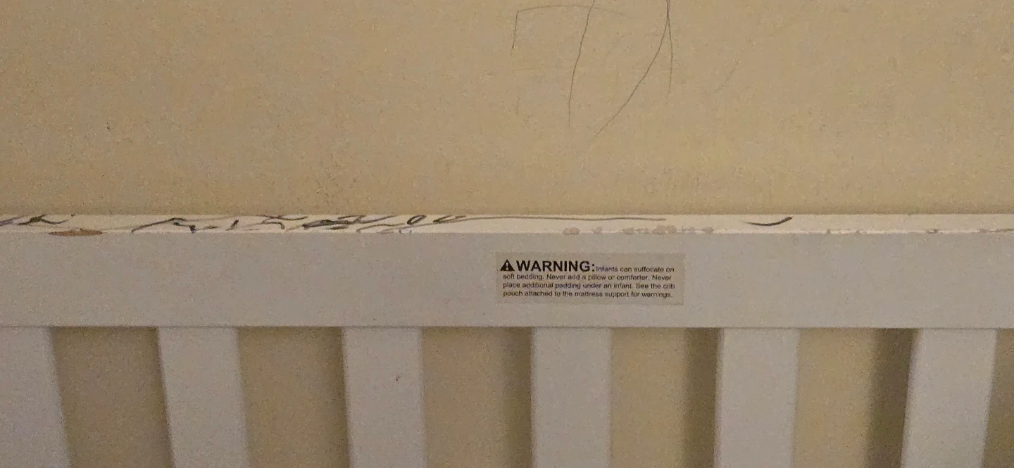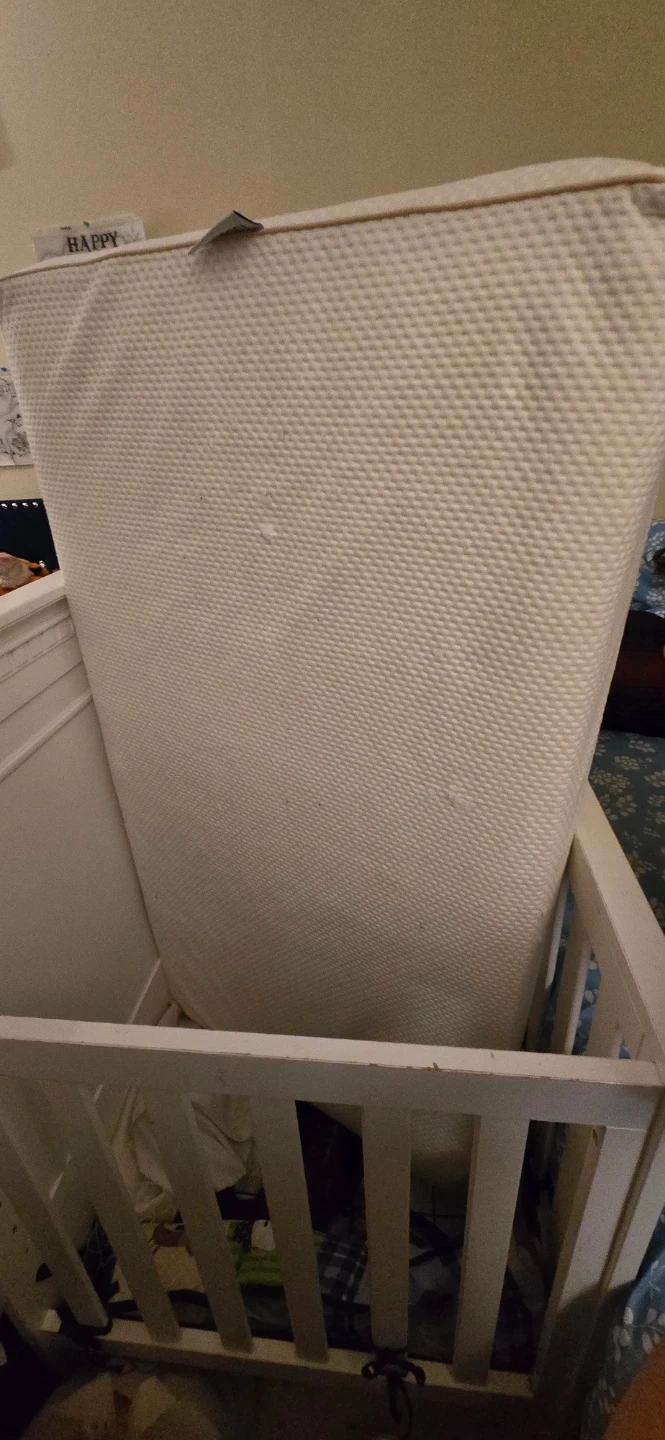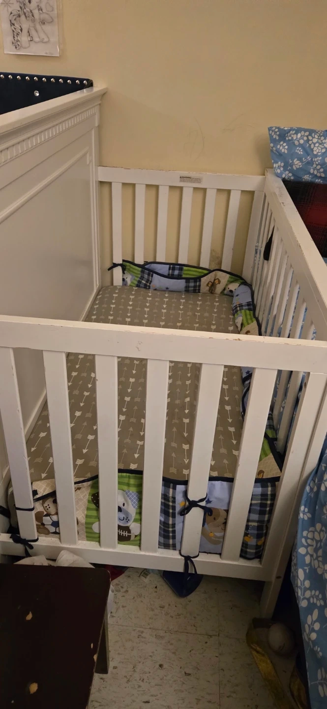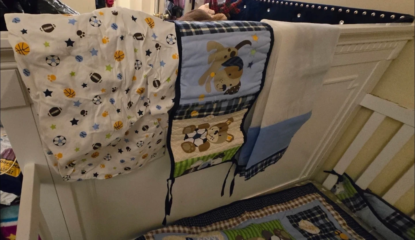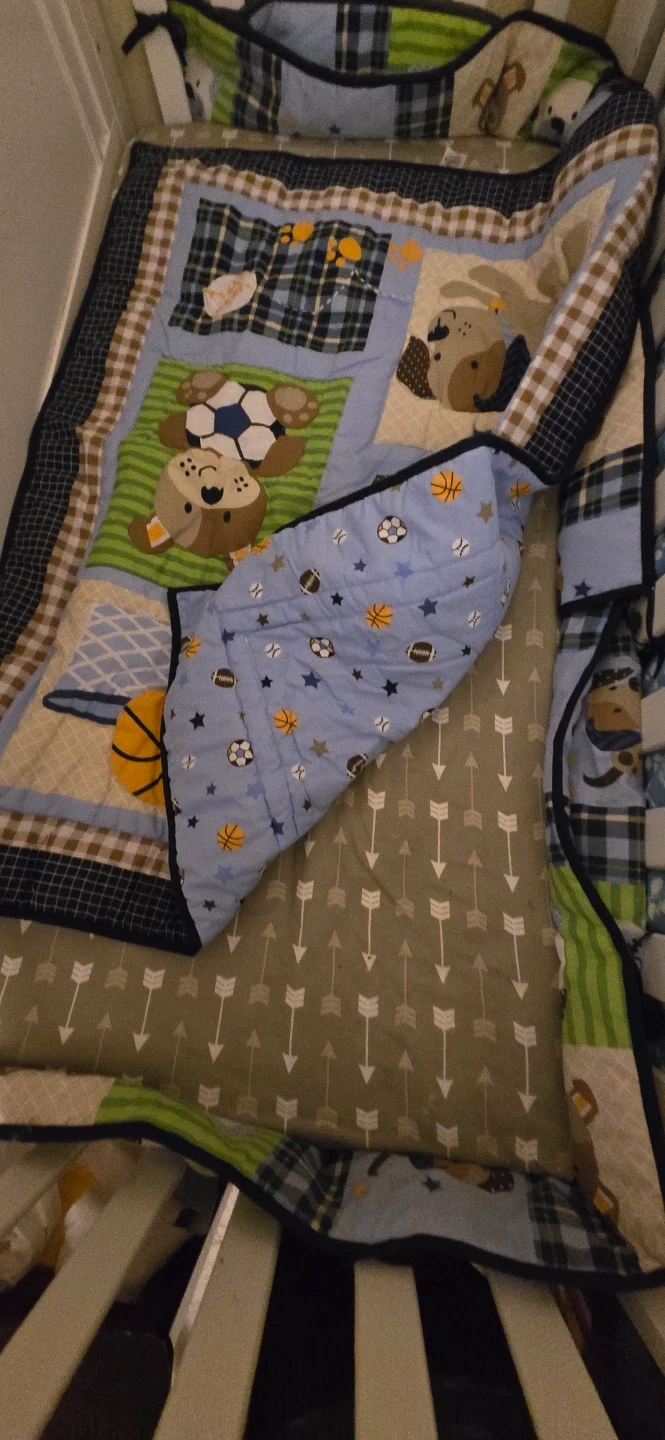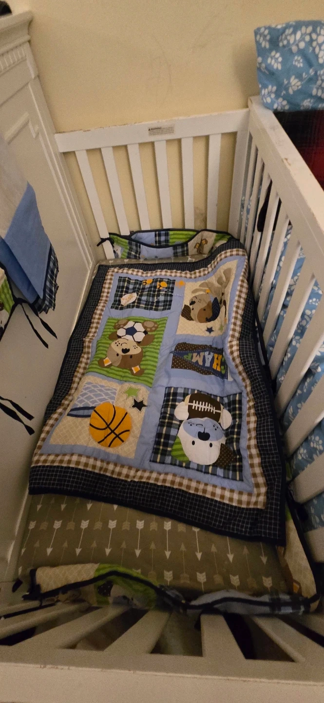 Selling a white baby crib that's in good condition. It comes with a cute bedding set. The bedding has sports-themed designs and playful dog patterns. Perfect for your little one's nursery!