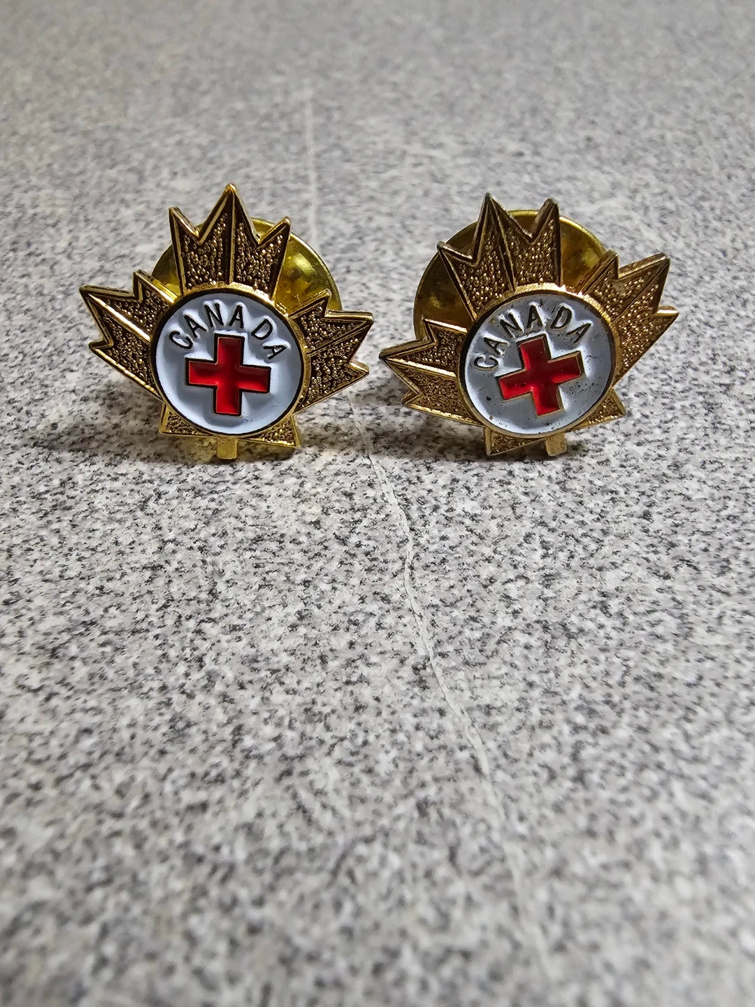 Two vintage Canada Red Cross lapel pins. Features a gold-toned maple leaf design with a white centre and red cross emblem. Standard pin backings. Perfect for collectors or showing Canadian pride!