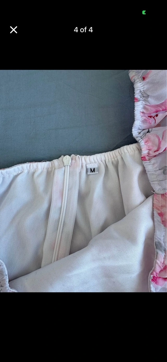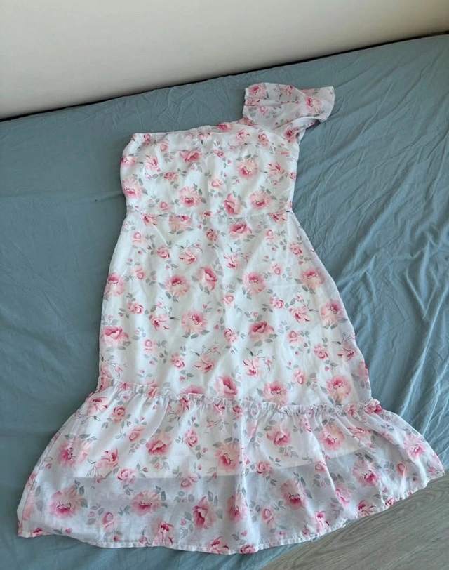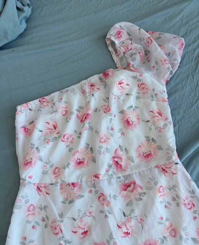 This adorable one-shoulder floral dress with a ruffle hem is perfect for a summer day! It's a size medium and in good, pre-loved condition, ready for its next adventure. Please note there is a small stain on the inside near the zipper, as shown in the photos. Selling for $20. Still available if the ad is up.