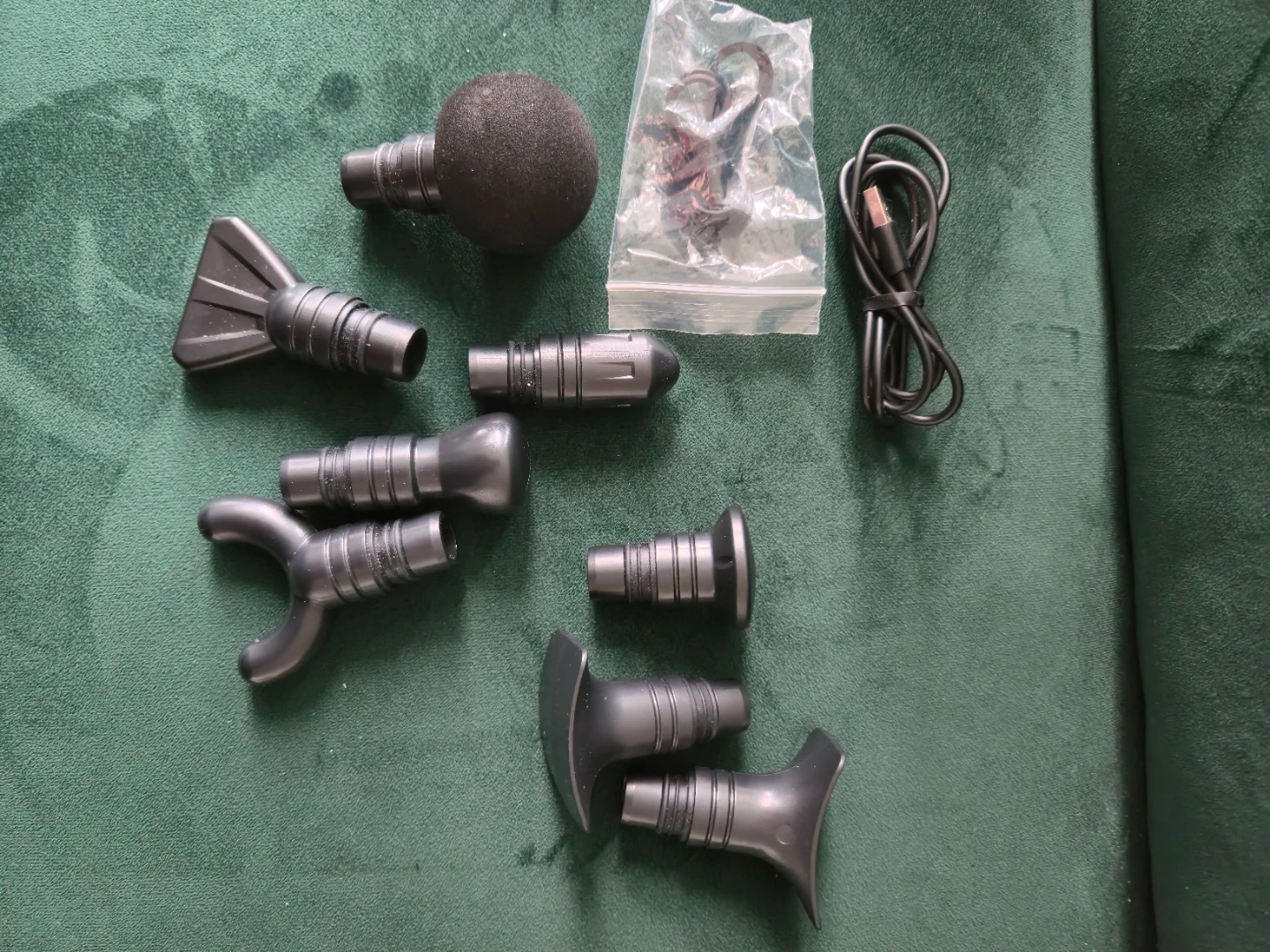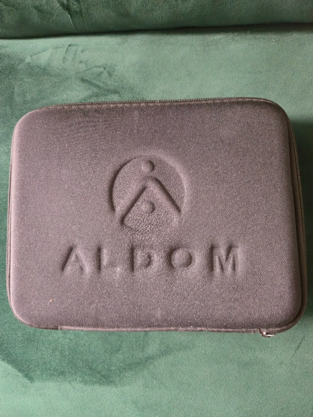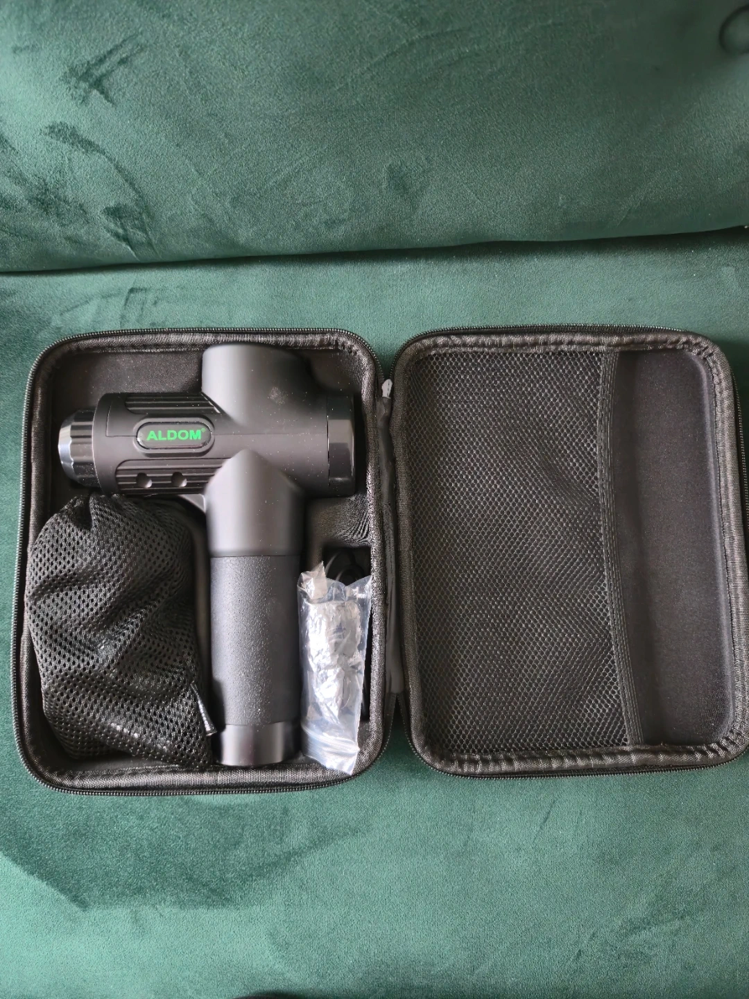 Aldom deep tissue massage gun with multiple massage heads included. It comes with a carrying case and USB charging cable. This percussion massager helps with muscle relief.
