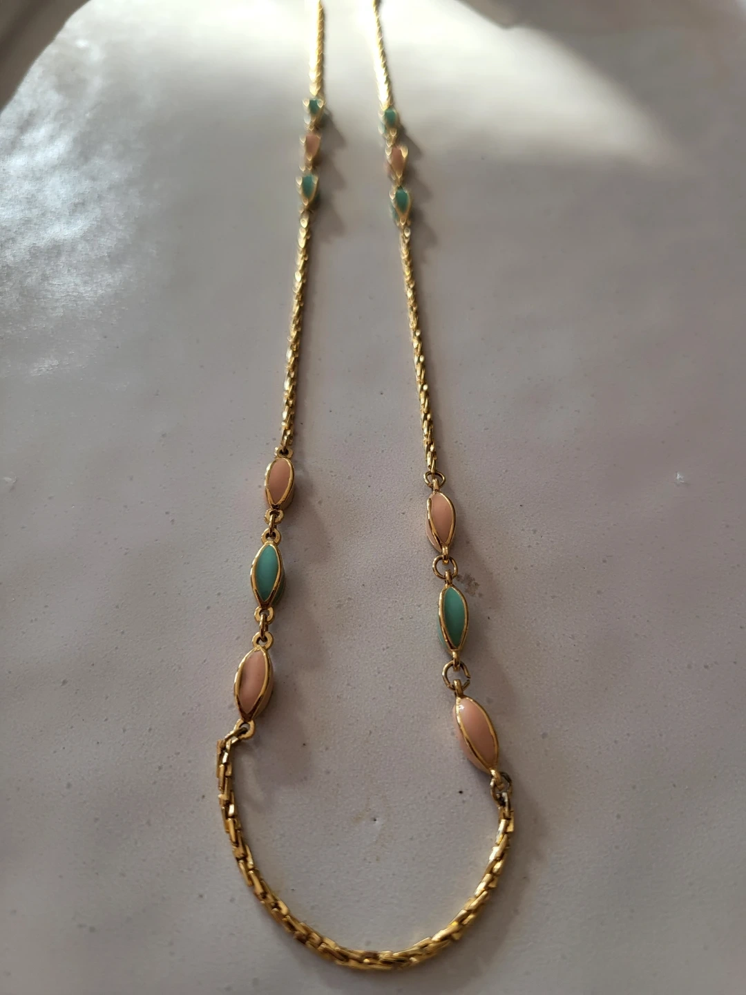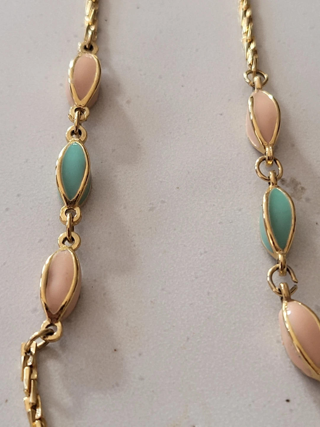 D'Orlan necklace with gold tone chain. It features alternating peach and teal coloured marquise-shaped beads. Clasp closure. A classic accessory!