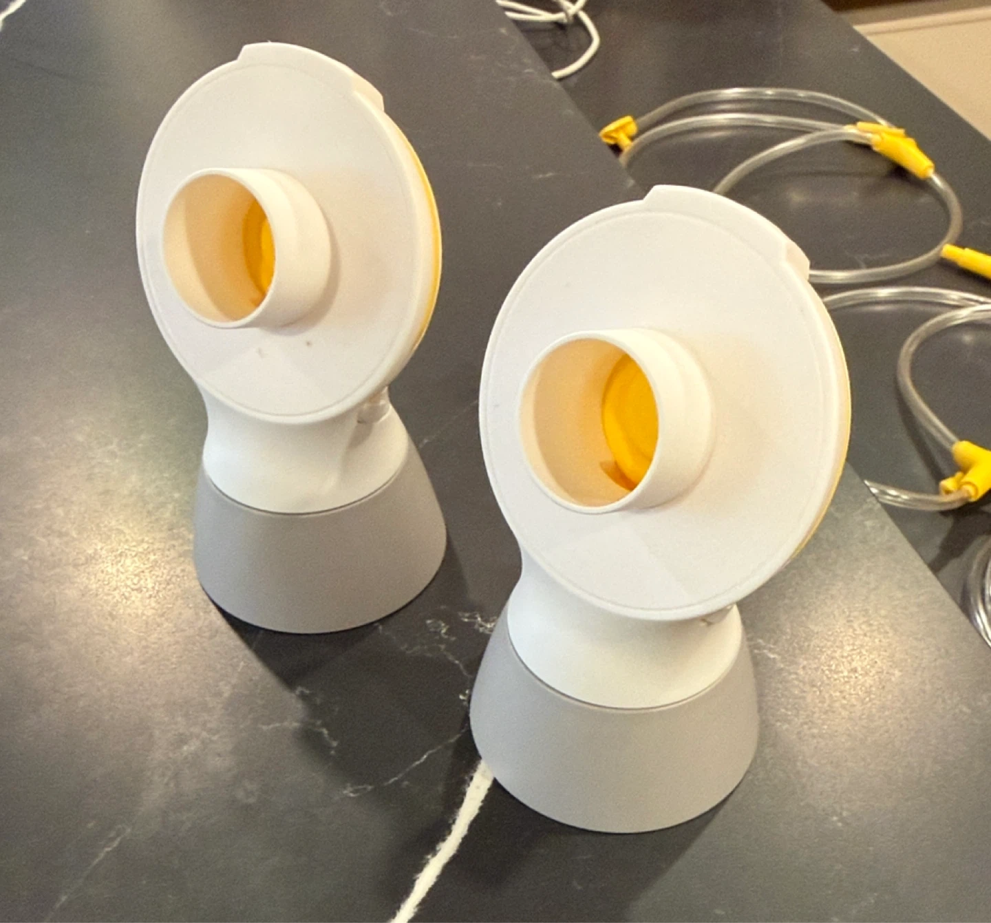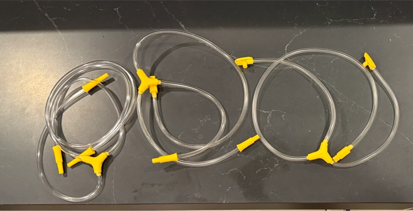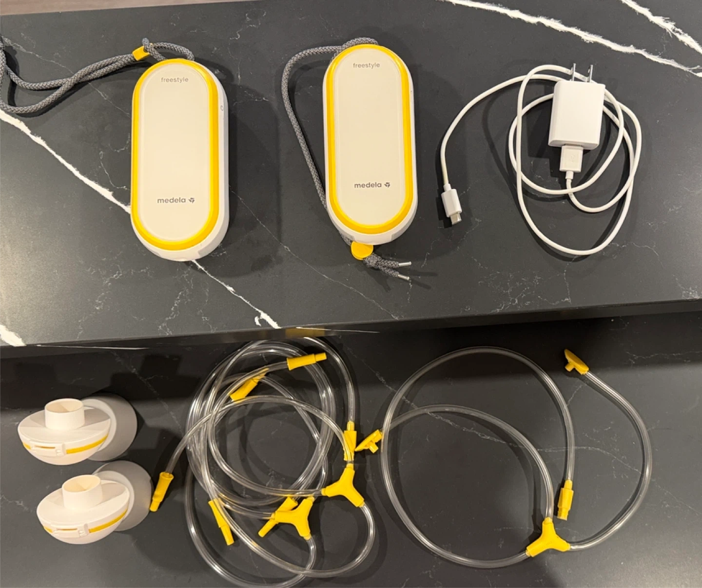 Medela Freestyle double electric breast pump. Comes with two breast shields, tubing, power adapter, and carrying strap. Lightweight and portable design.