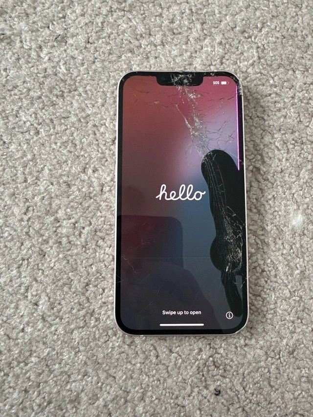 Used iPhone 13. Very cracked/bent but still functioning. Screen is black in some places and cameras are damaged. Can be used for repair/parts. Factory reset. 128GB storage. Please reach out if you have any questions!