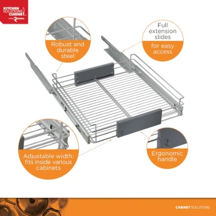 BRAND NEW IN BOX. Organize your kitchen cabinets like a professional with this adjustable pullout. Designed for lower cabinet and pantry applications, it pulls from the cabinet giving you full accessibility, keeping your kitchen accessories and foods well organized!