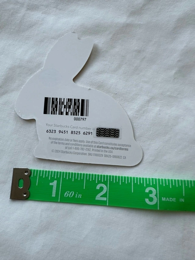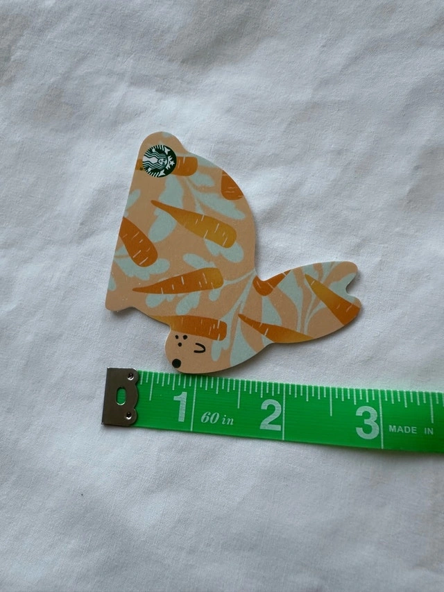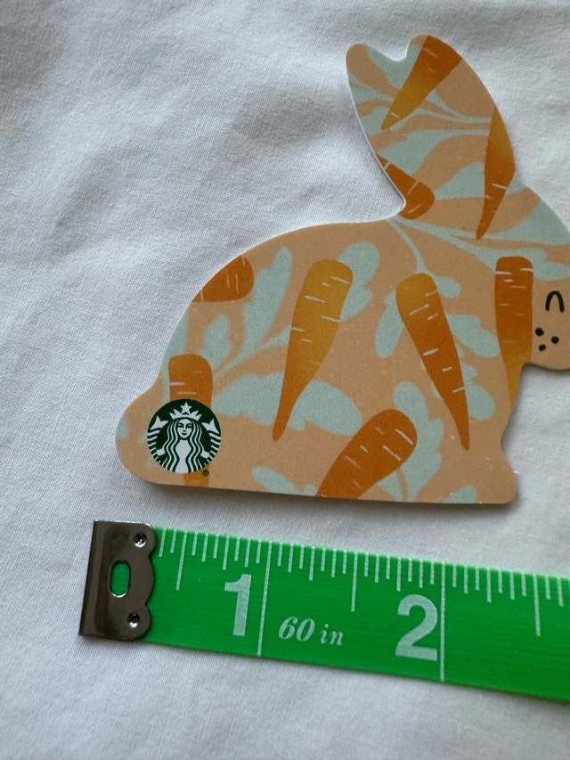I have a brand new Starbucks gift card, shaped like a bunny with carrots, that would make a perfect little present for someone. It's never been registered, so it's ready to be loaded with value and enjoyed! This is a novelty gift card with no value on it. See photos for condition. Let me know if you're interested!