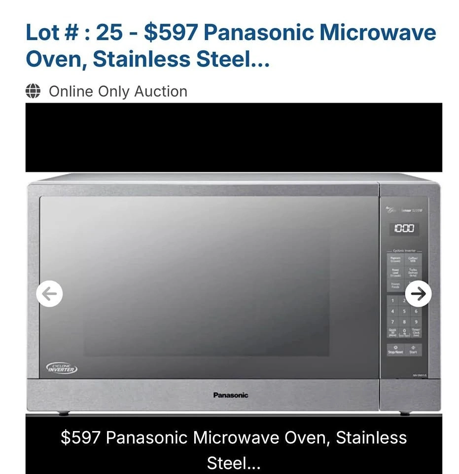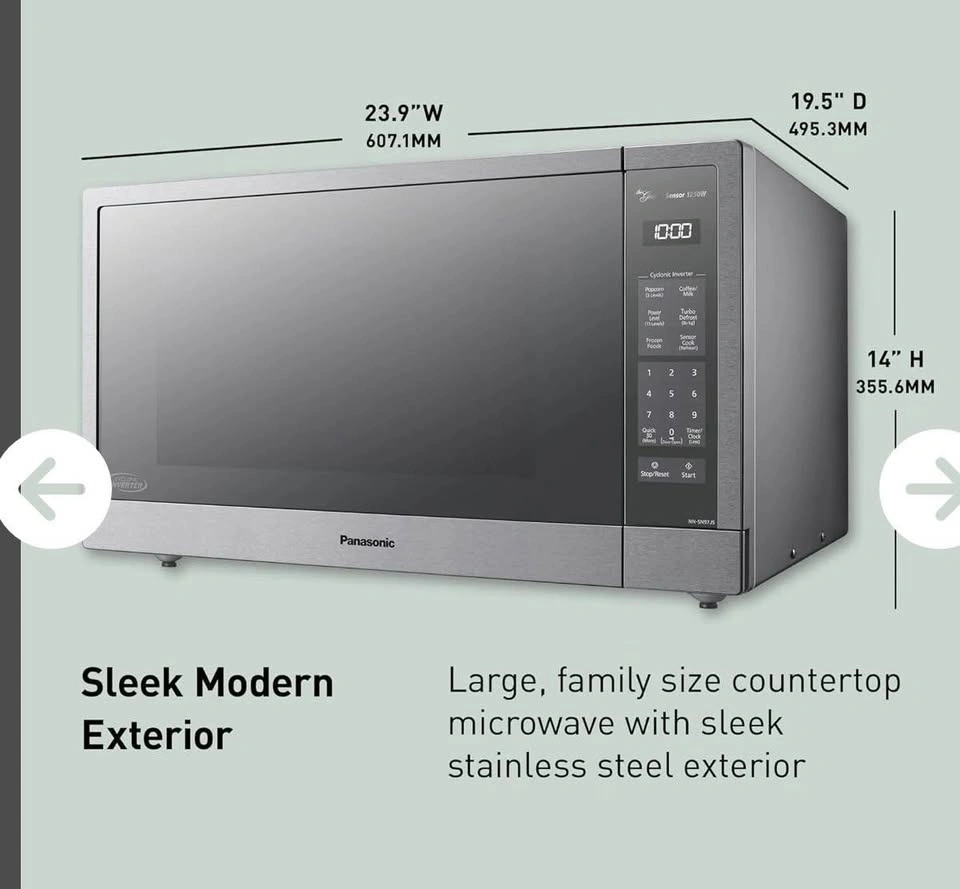 This is an open box Panasonic microwave, model NN-SN97JS. It's a countertop or built-in model with Cyclonic Wave and Inverter Technology, featuring a Genius Sensor. It has a 2.2 Cu. Ft. capacity and 1250W power. The unit is silver and comes in its original packaging. It has not been tested but is functional and has no damage or missing parts. Let me know if you're interested!