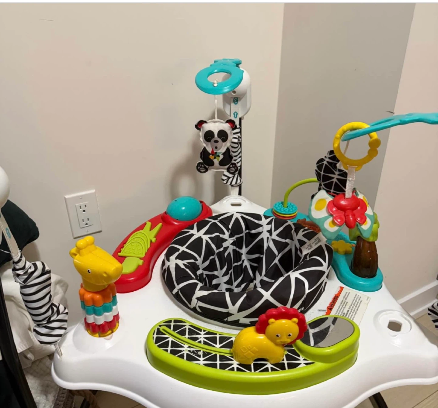 This Baby Einstein activity jumper offers a variety of engaging toys for little ones. It's designed for playtime and exploration with multiple interactive elements. The seat swivels, allowing baby to reach different toys.