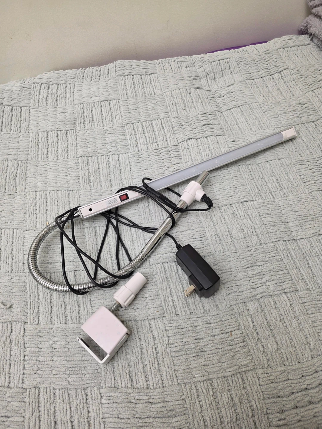 This is an LED desk lamp with a flexible gooseneck and a clamp mount. It includes a power adapter and a clip for attachment. The lamp has an on/off switch on the fixture.