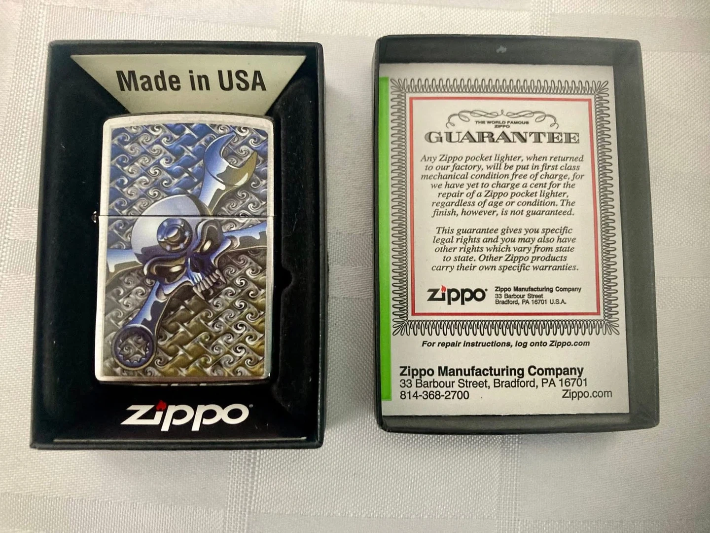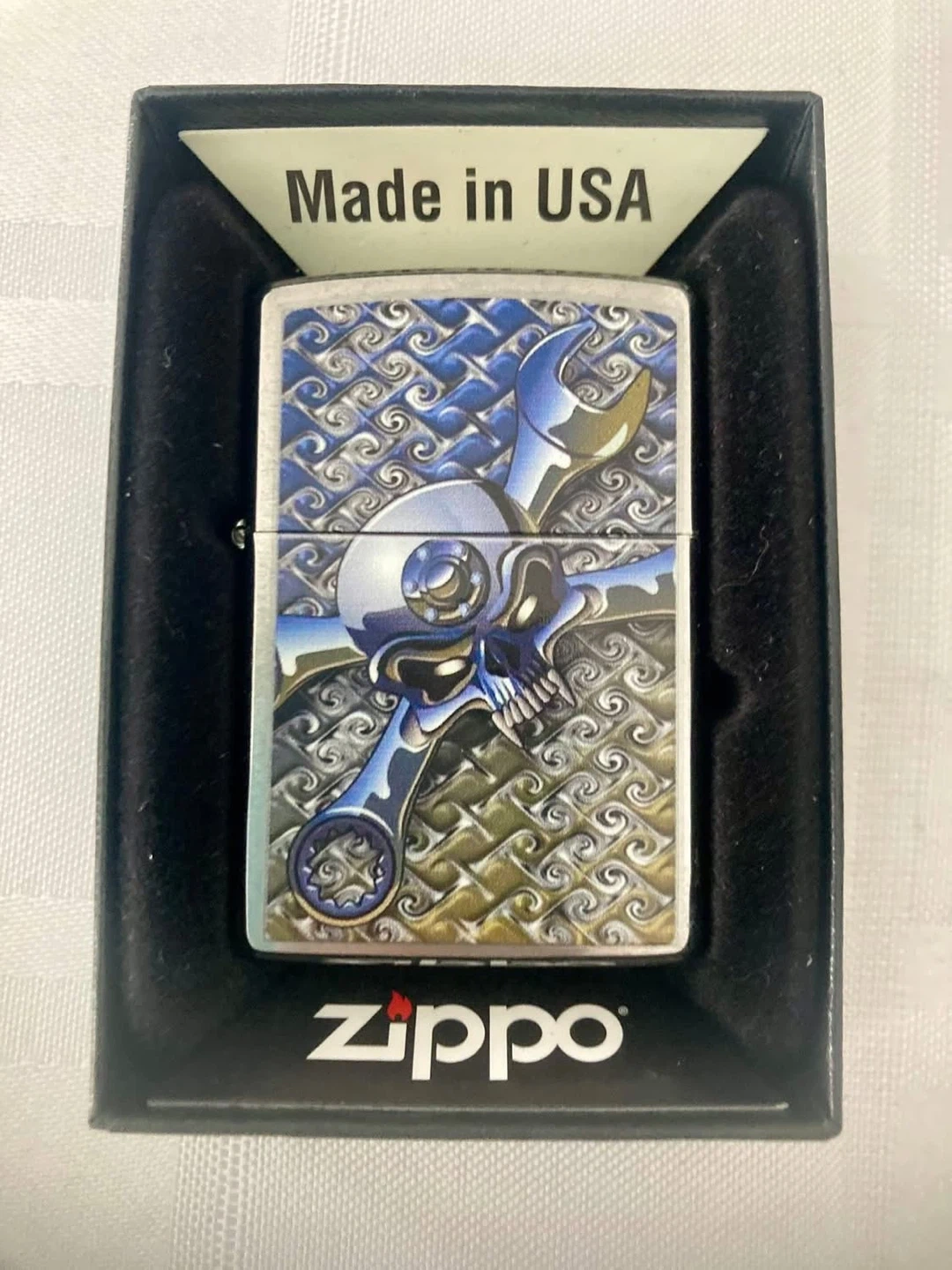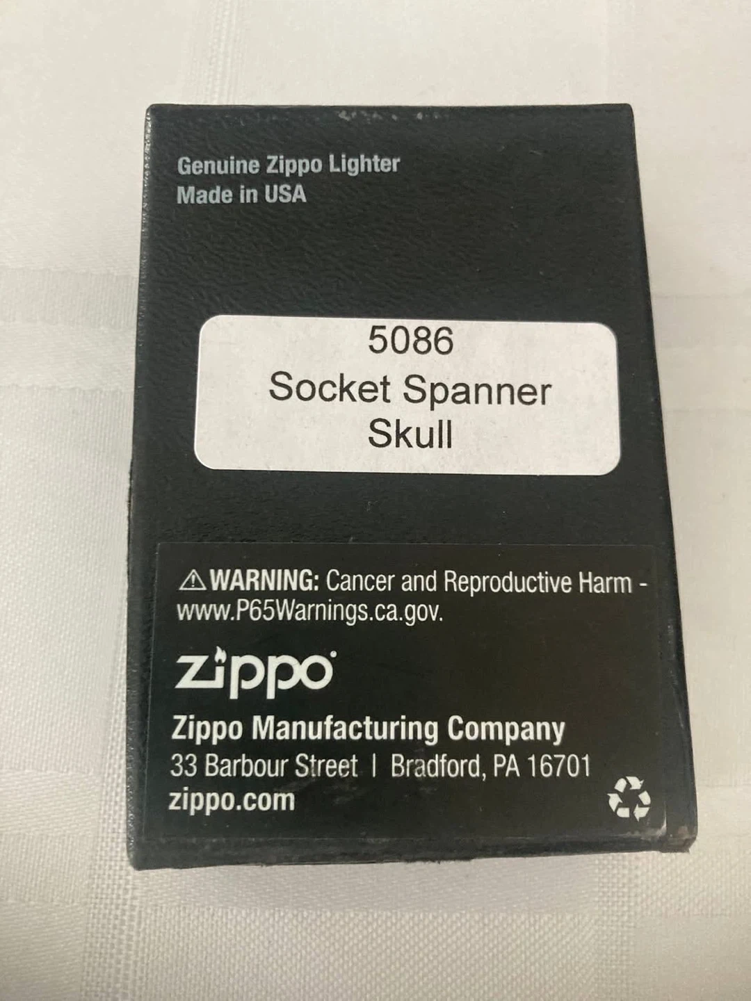 Check out this collectable Zippo lighter featuring a unique socket spanner skull design, made in the USA and in new condition, complete with its original box and paperwork. This is a genuine Zippo lighter, perfect for collectors or Zippo enthusiasts.