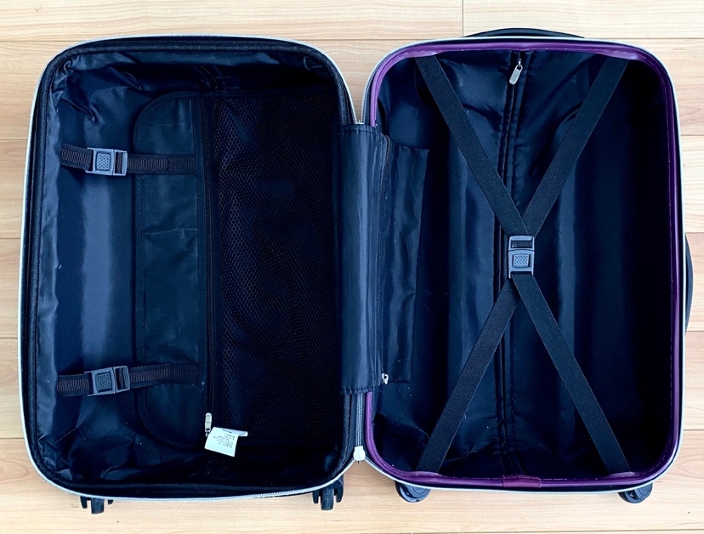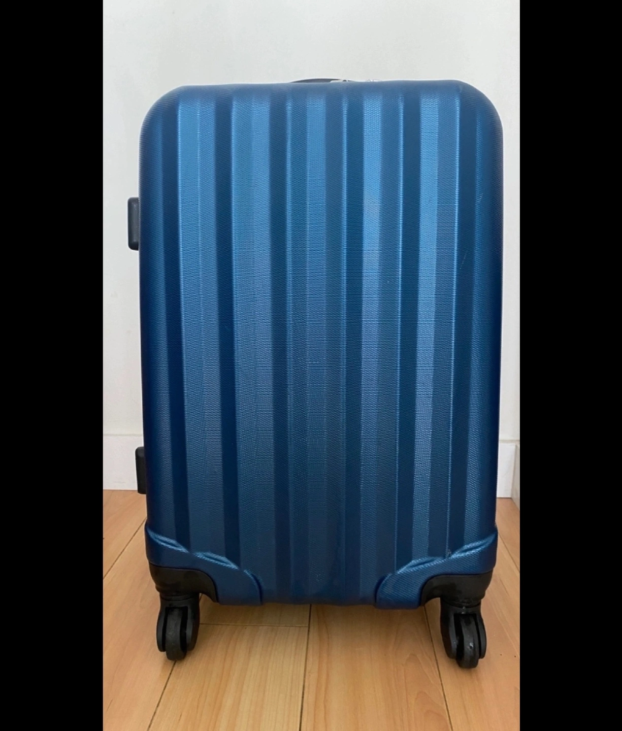 Hard-shell carry-on suitcase.