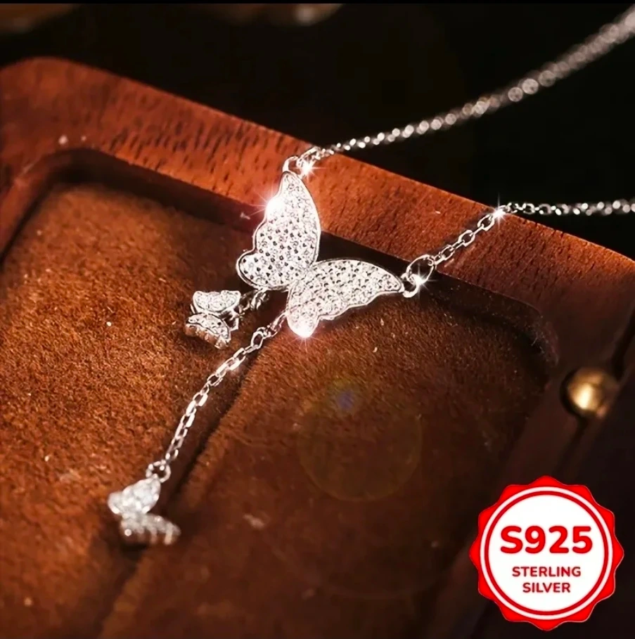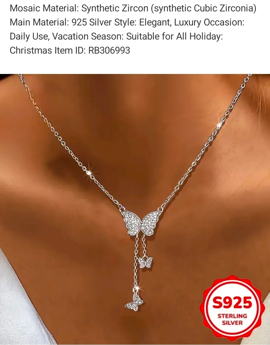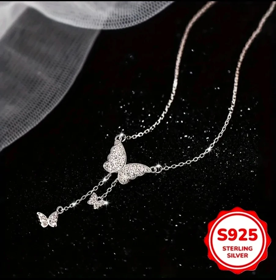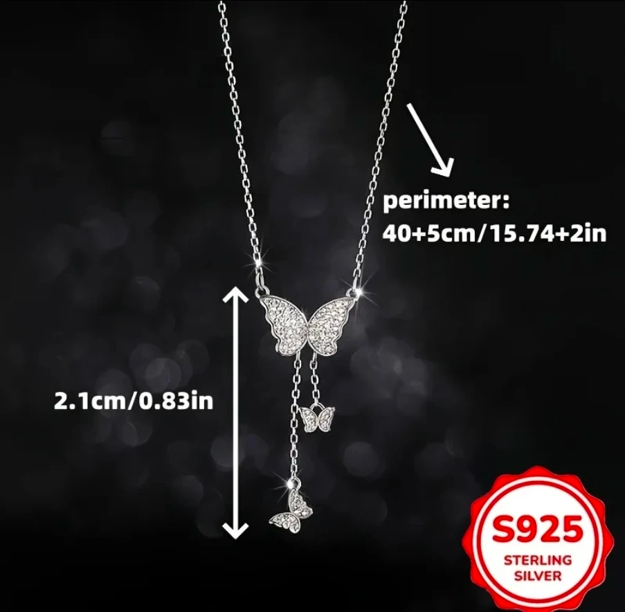This elegant necklace is crafted from S925 sterling silver and features a beautiful butterfly design. It is adorned with synthetic zircon stones, adding a touch of sparkle. The necklace is perfect for daily wear or special occasions like Christmas and vacations. The perimeter of the necklace is 40+5cm (15.74+2in), and the butterfly pendant is 2.1cm (0.83in) in length. 3.41 grams .