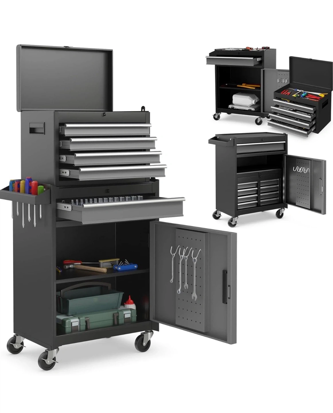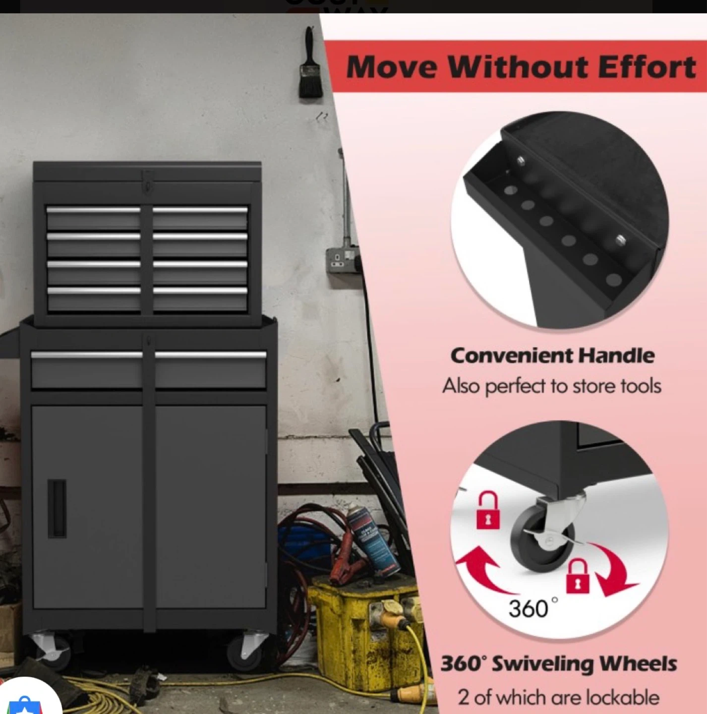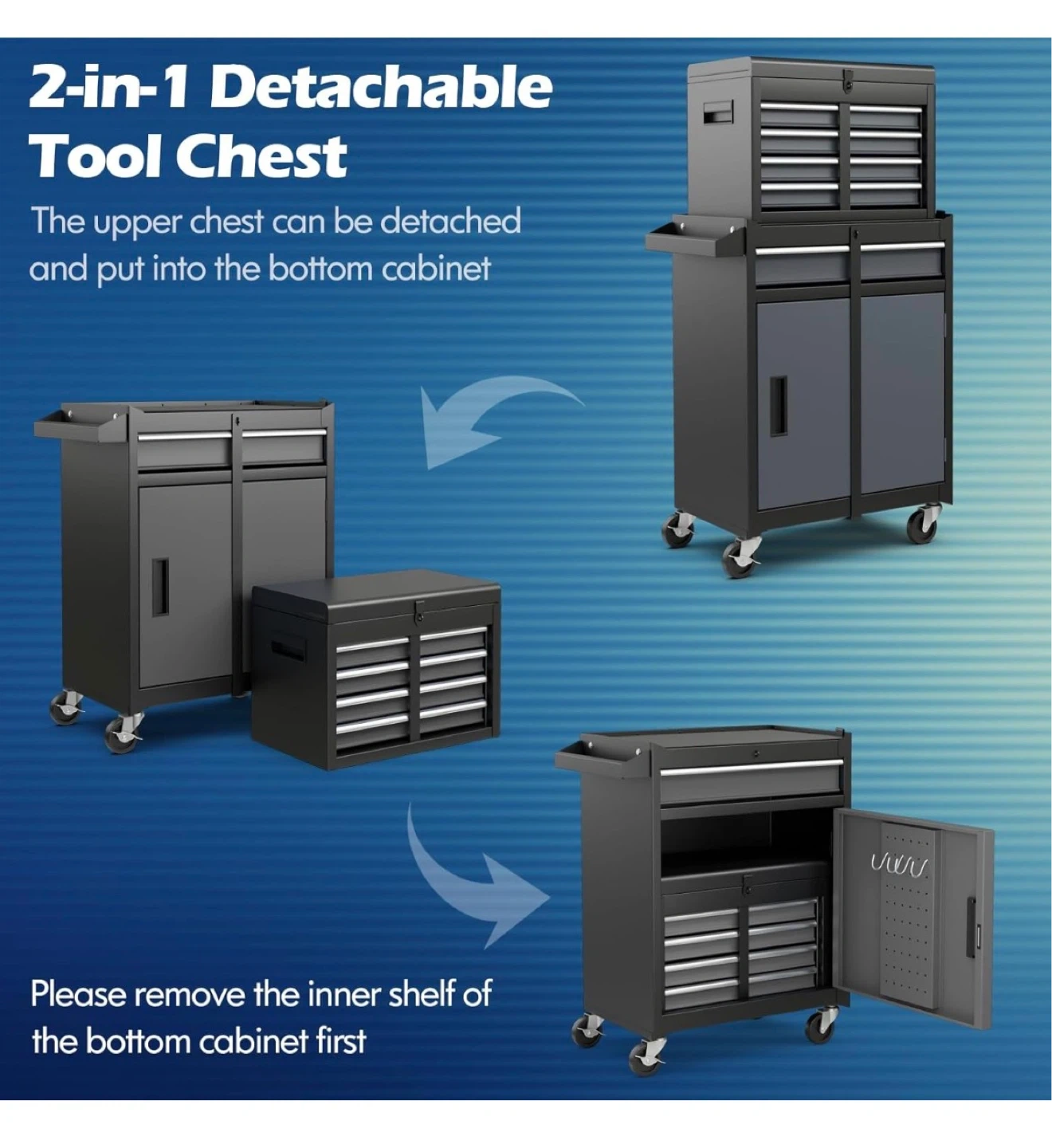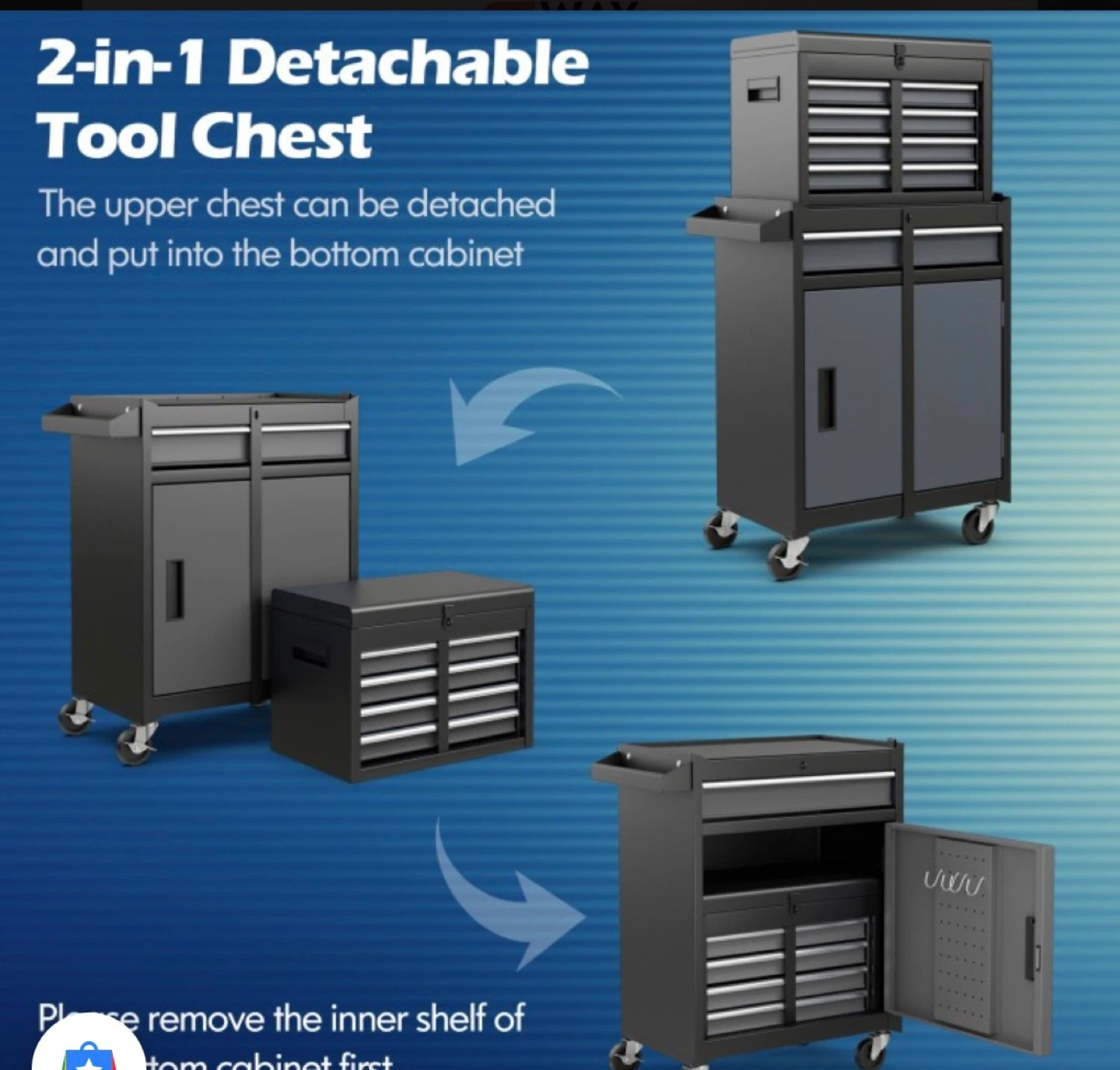 Brand new 2-in-1 tool chest and cabinet with detachable top chest, multiple drawers, and rolling wheels. Made from durable powder-coated metal with locking system for safety. Ideal for garage, workshop, or home use.