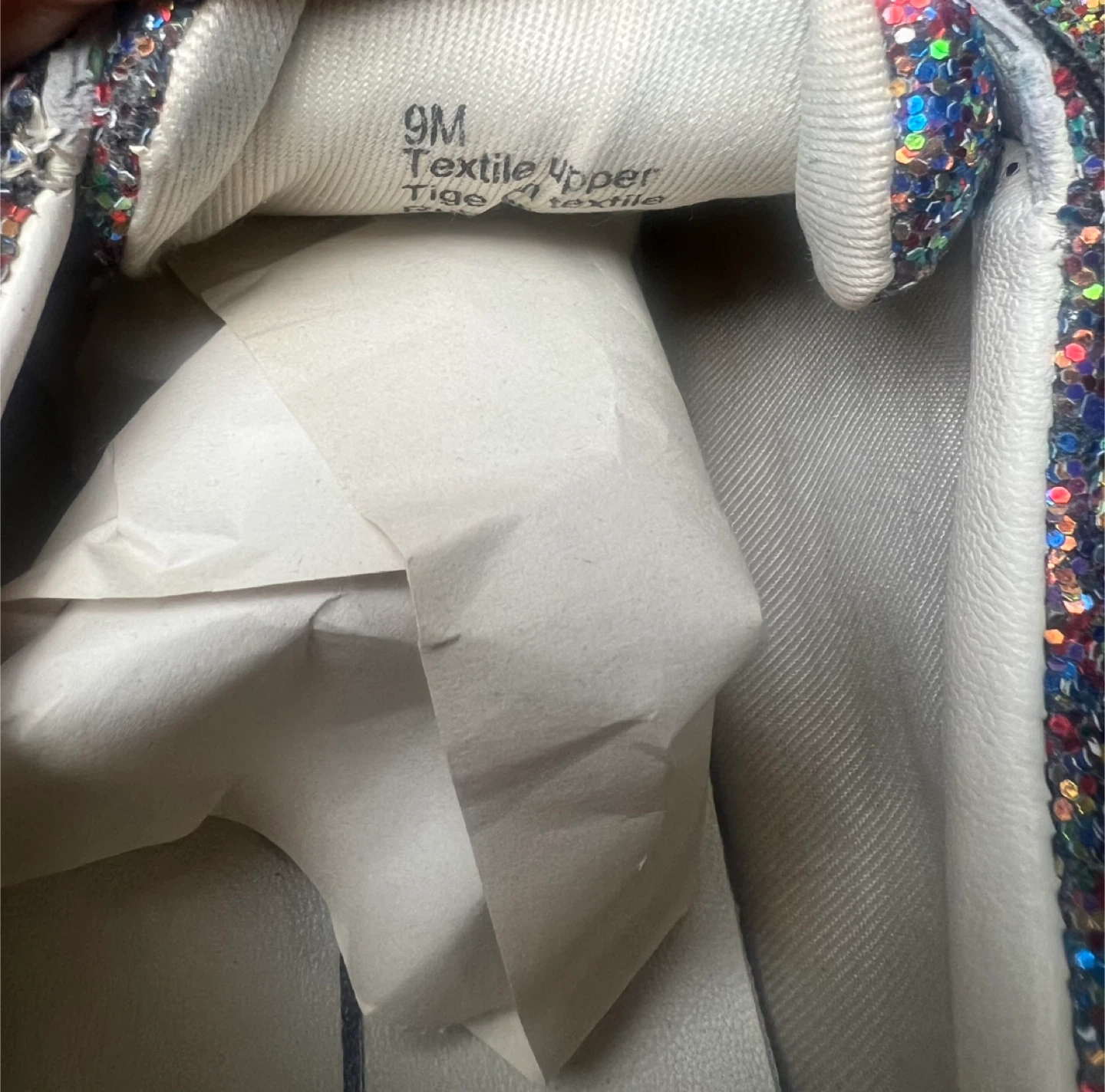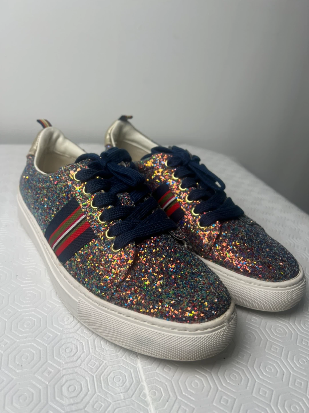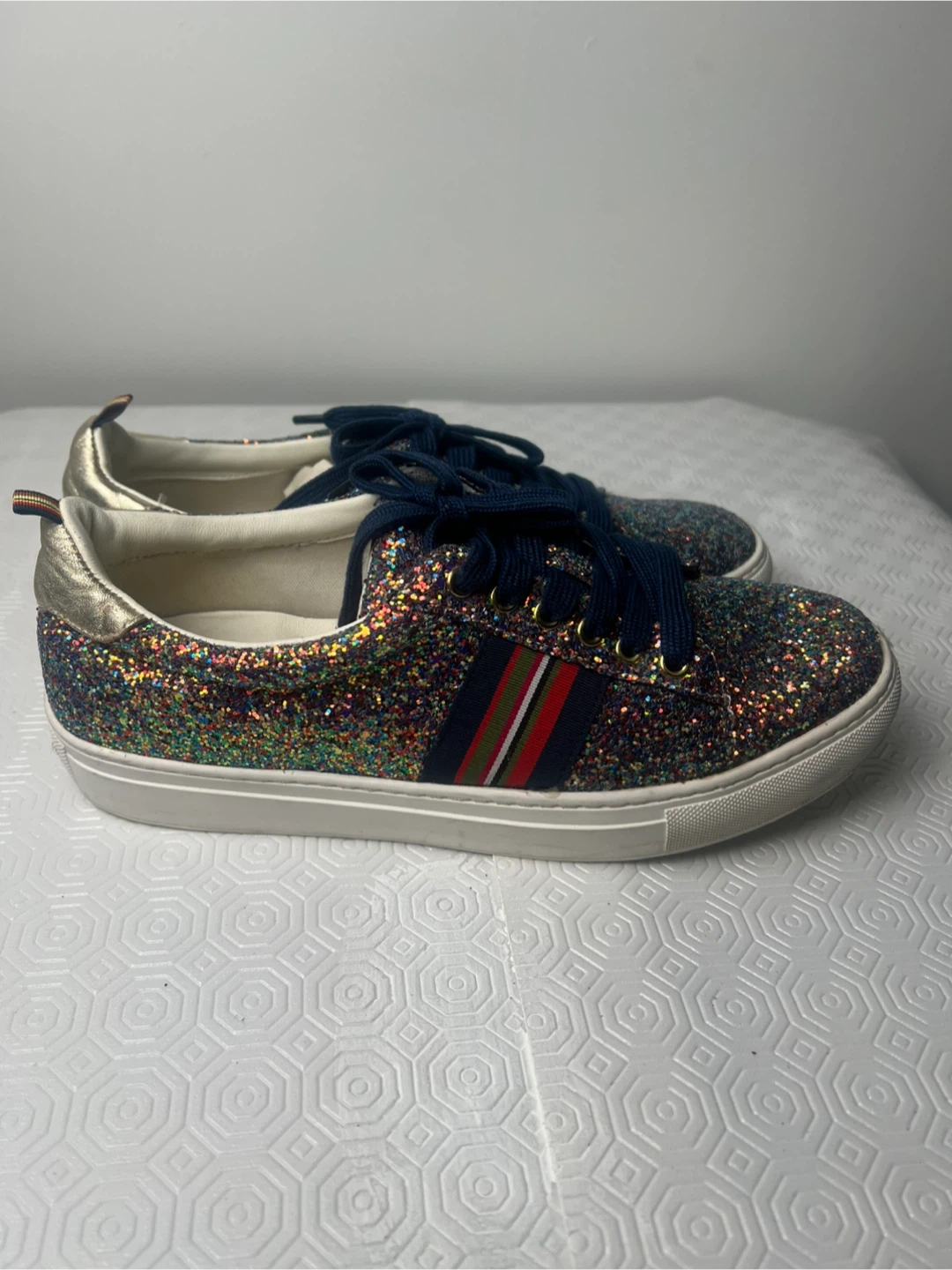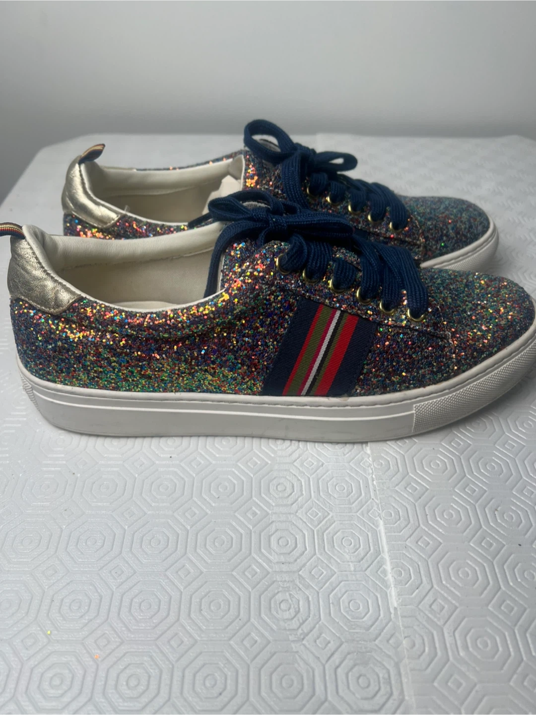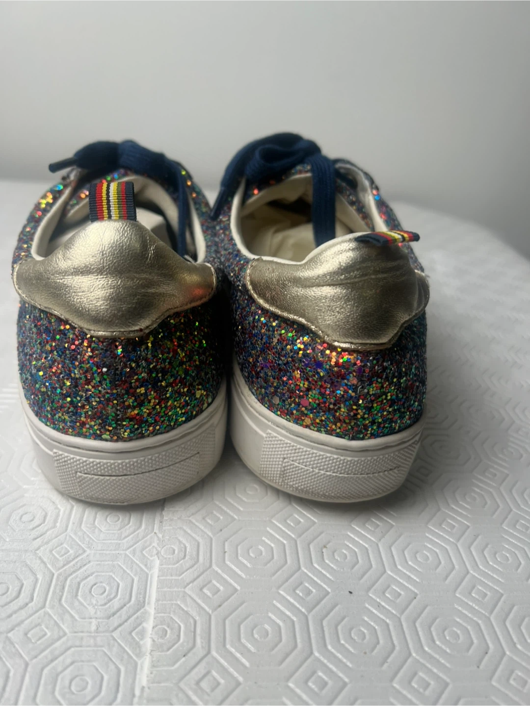 Sparkly glitter sneakers with navy blue laces and gold heel accents. They feature a colourful stripe detail on the side. The soles are white rubber.