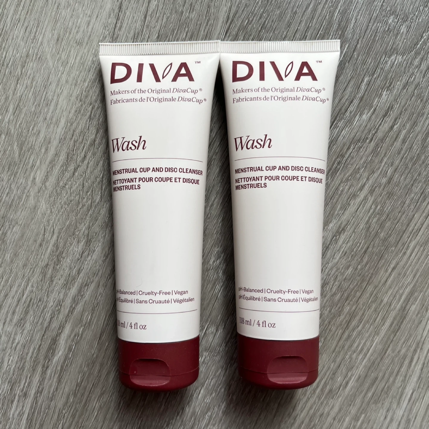 Diva Wash, a menstrual cup and disc cleanser. It's pH-balanced, cruelty-free, and vegan. Each tube contains 118 ml or 4 fl oz.