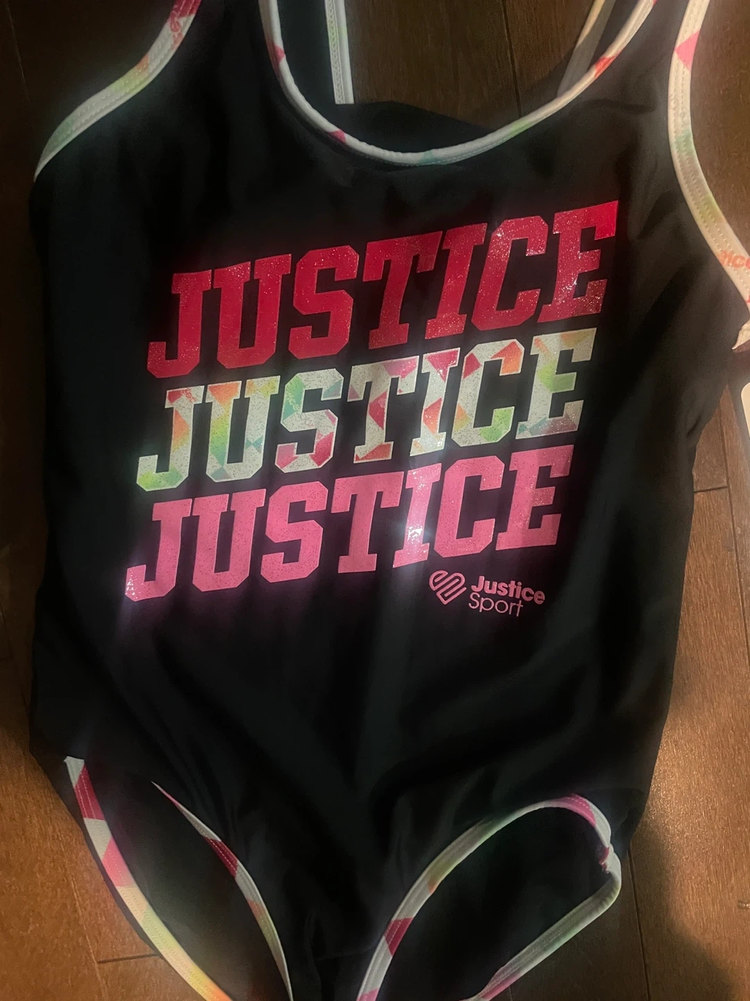 This black Justice Sport swimsuit features a repeating "JUSTICE" graphic with colourful accents. It has contrasting trim along the straps and leg openings. Size L/G.