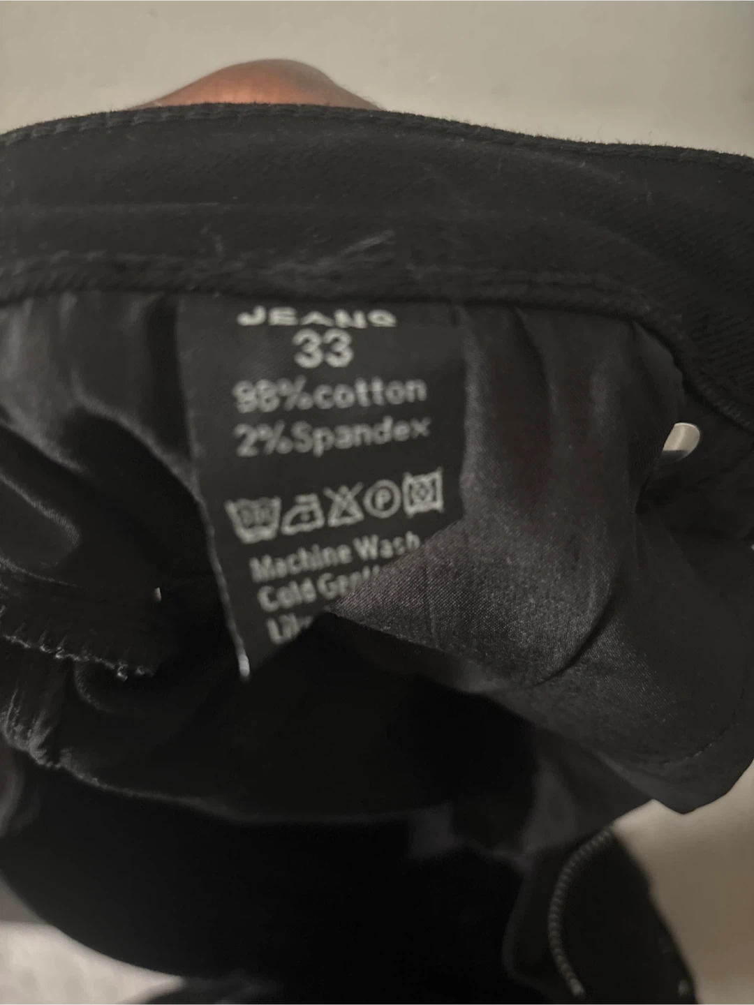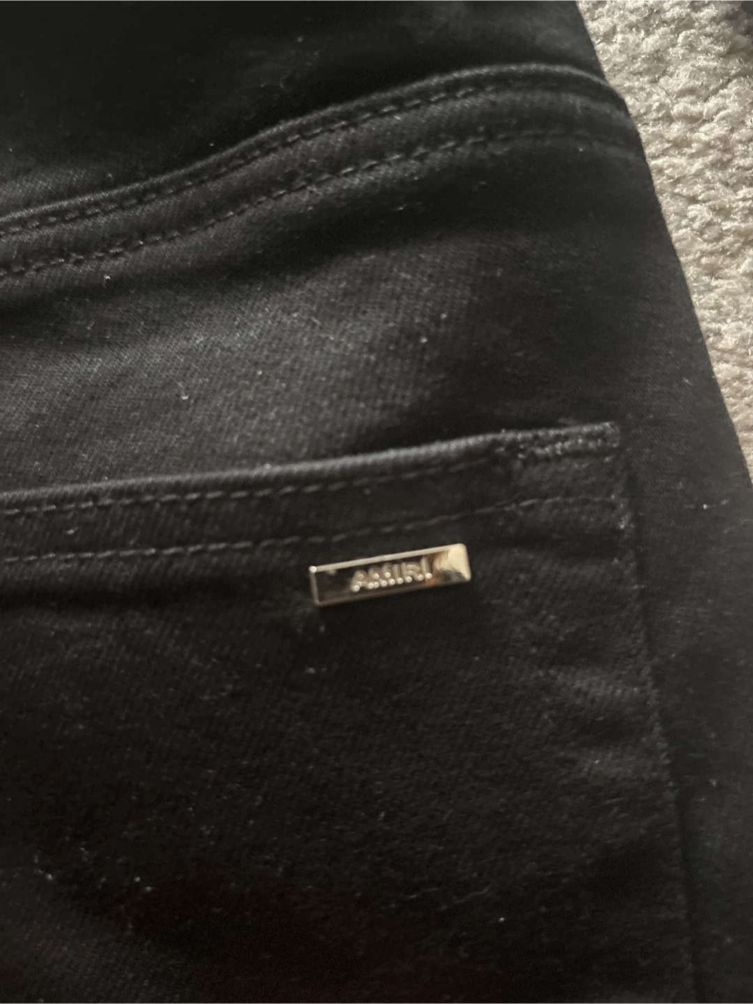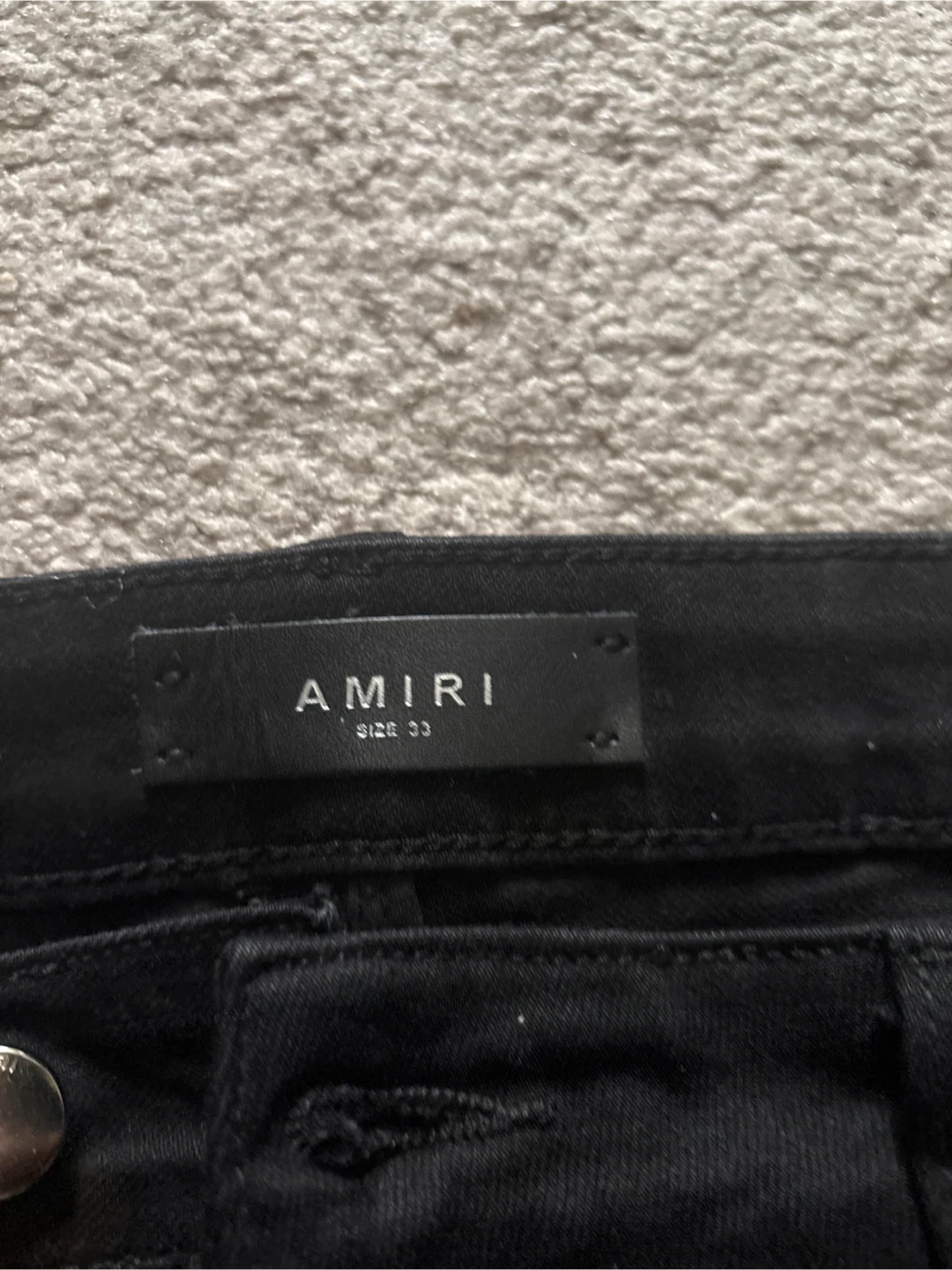 These are AMIRI black jeans with a distressed design. They're a size 33 waist. Perfect for adding an edge to your outfit!