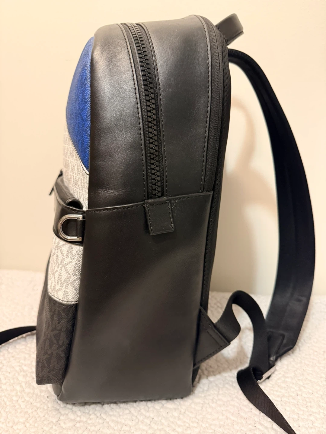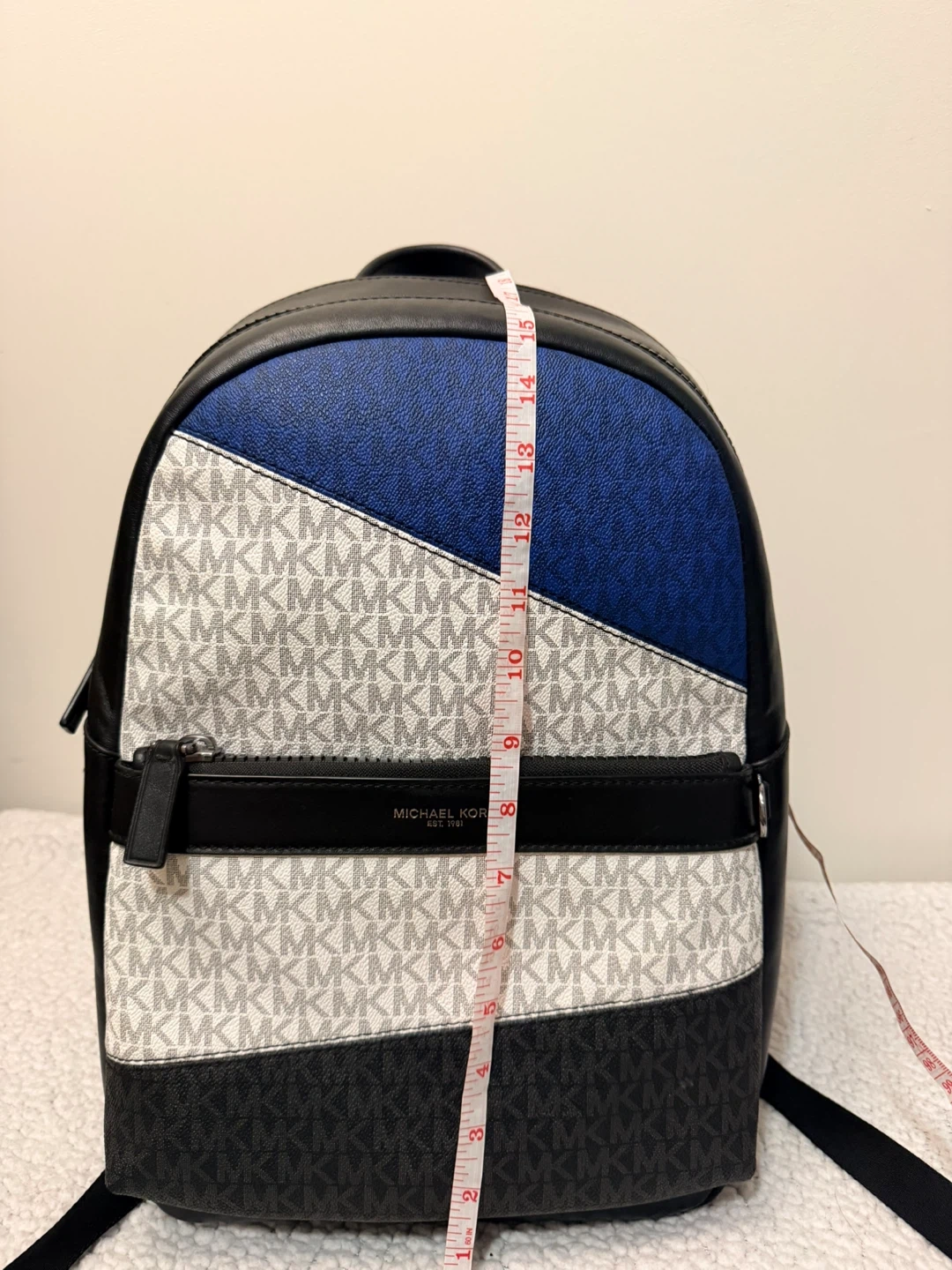 A Michael Kors backpack with MK all-over print and colourblock design. It features adjustable straps and a zippered front pocket. This bag is great for everyday use.