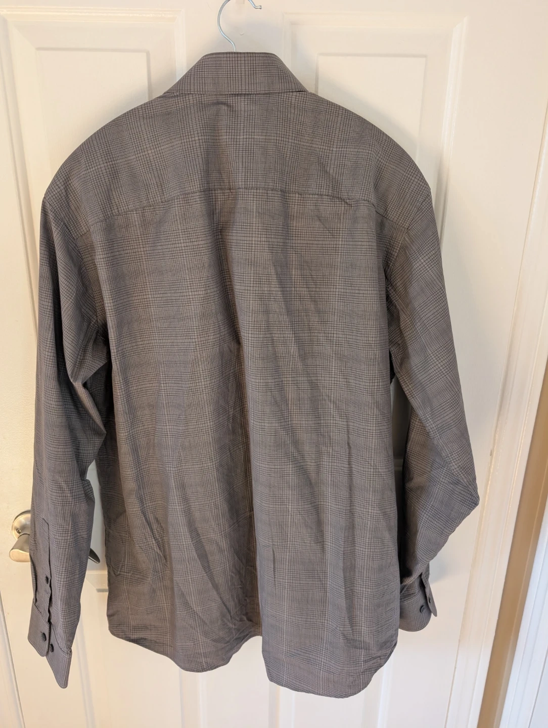 Calvin Klein long sleeve dress shirt in a grey plaid pattern. It's a regular fit with a port collar. Material is a blend, soft to the touch. Easy to dress up or down!