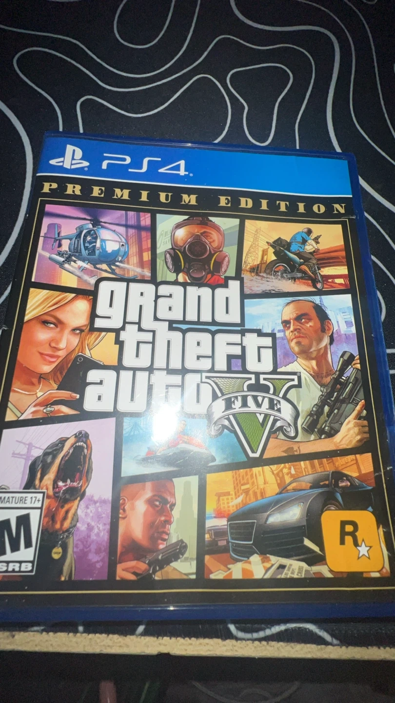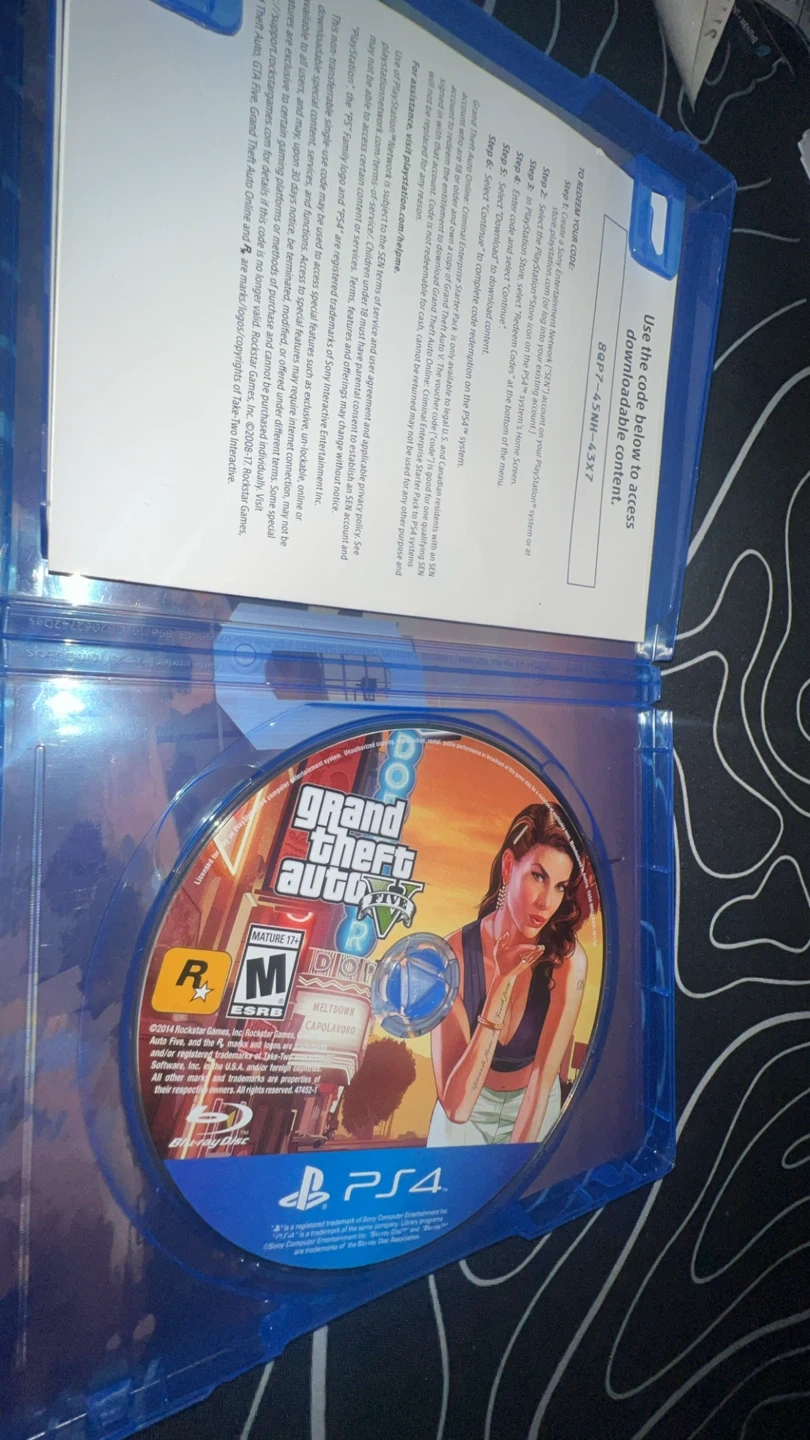 Grand Theft Auto V Premium Edition for PlayStation 4. Includes game disc and case with manual. A code for downloadable content is also included.