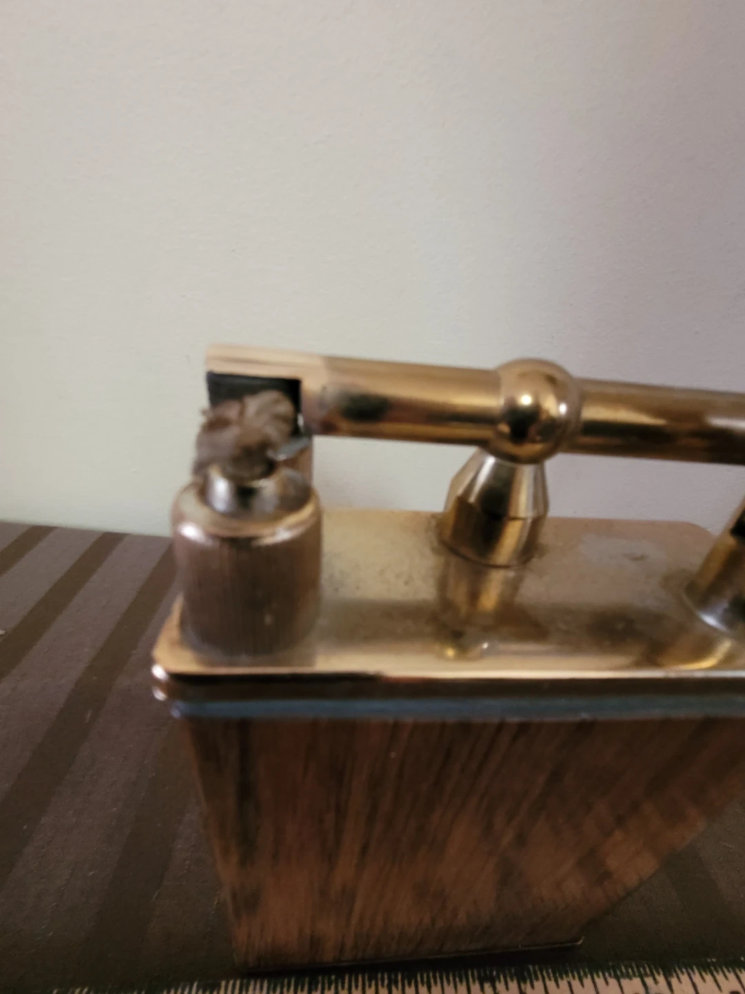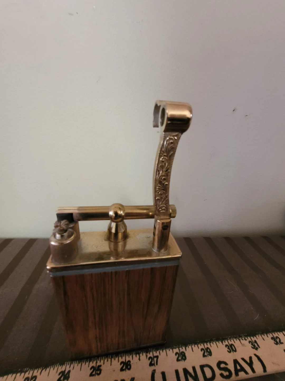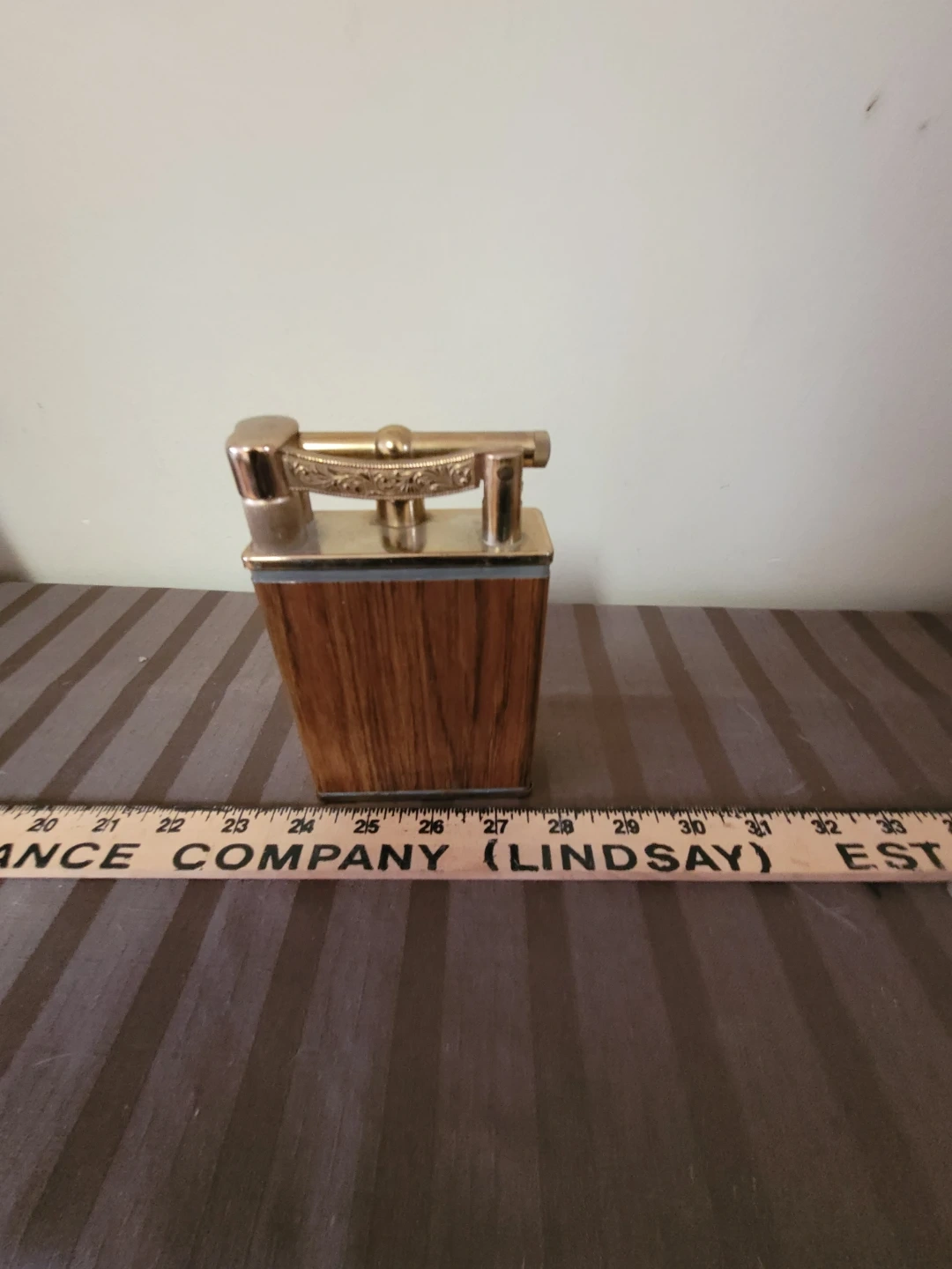 A classic Sabre Made in Japan Vintage Table lighter featuring a wood-grain effect on the body with gold-tone accents. This lighter has a distinct ornate lever. It's a statement piece for any collection. In great condition would need gas and a flint used once year ago. Asking $50 pick up on beaverbrook lane Kanata thank you