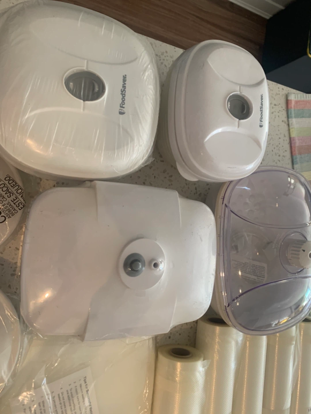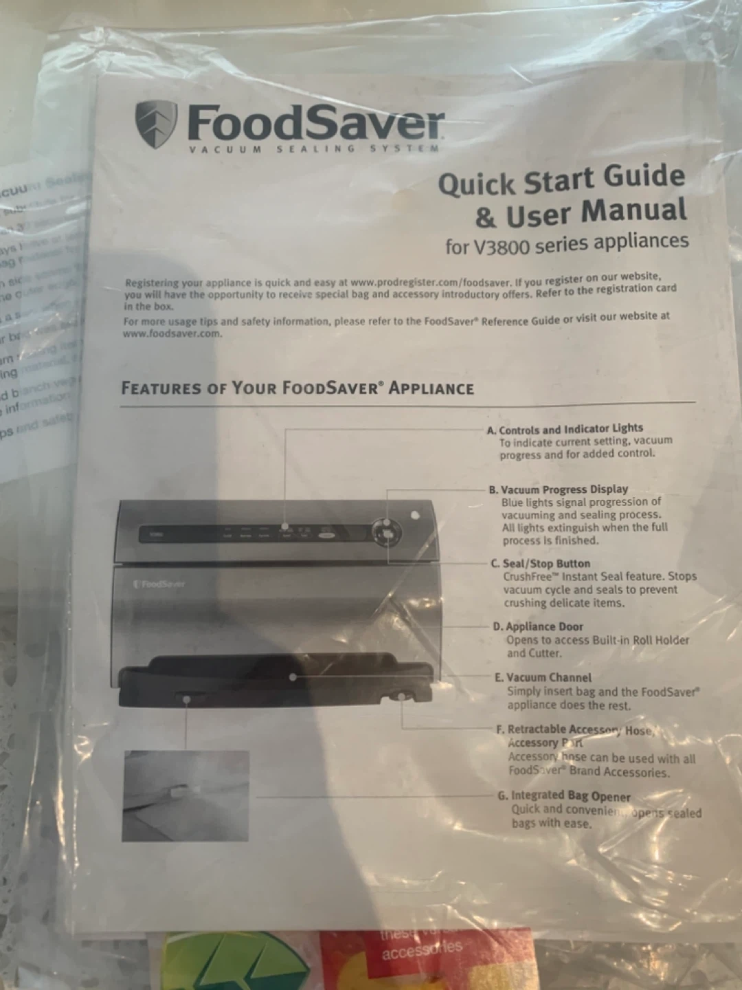 FoodSaver V3825 vacuum sealing system. Comes with a set of five vacuum seal rolls & several containers. It's great for preserving food and keeping it fresh longer. The appliance includes a quick start guide and user manual.
