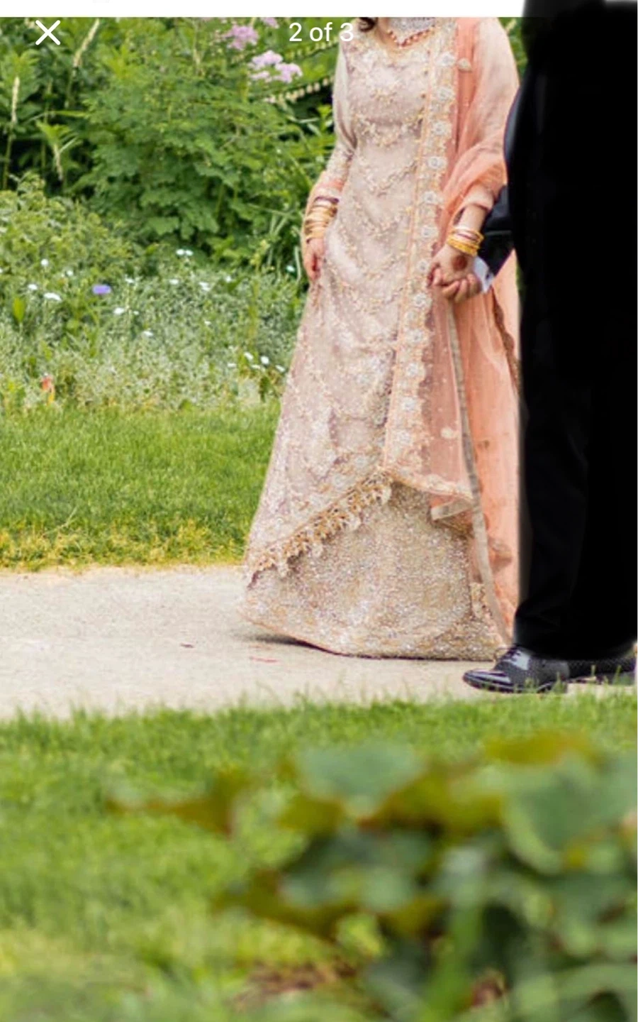 A stunning kameez featuring intricate white and gold beadwork and embroidery. It comes with a matching peach dupatta . This outfit is perfect for formal events or celebrations!