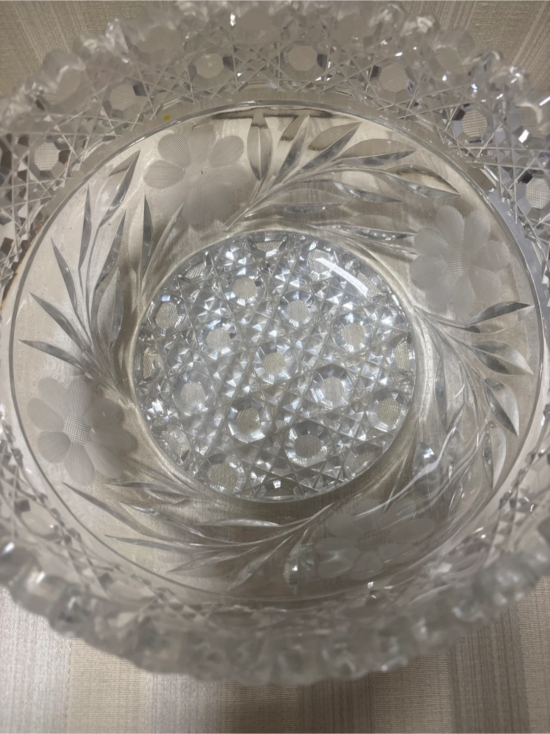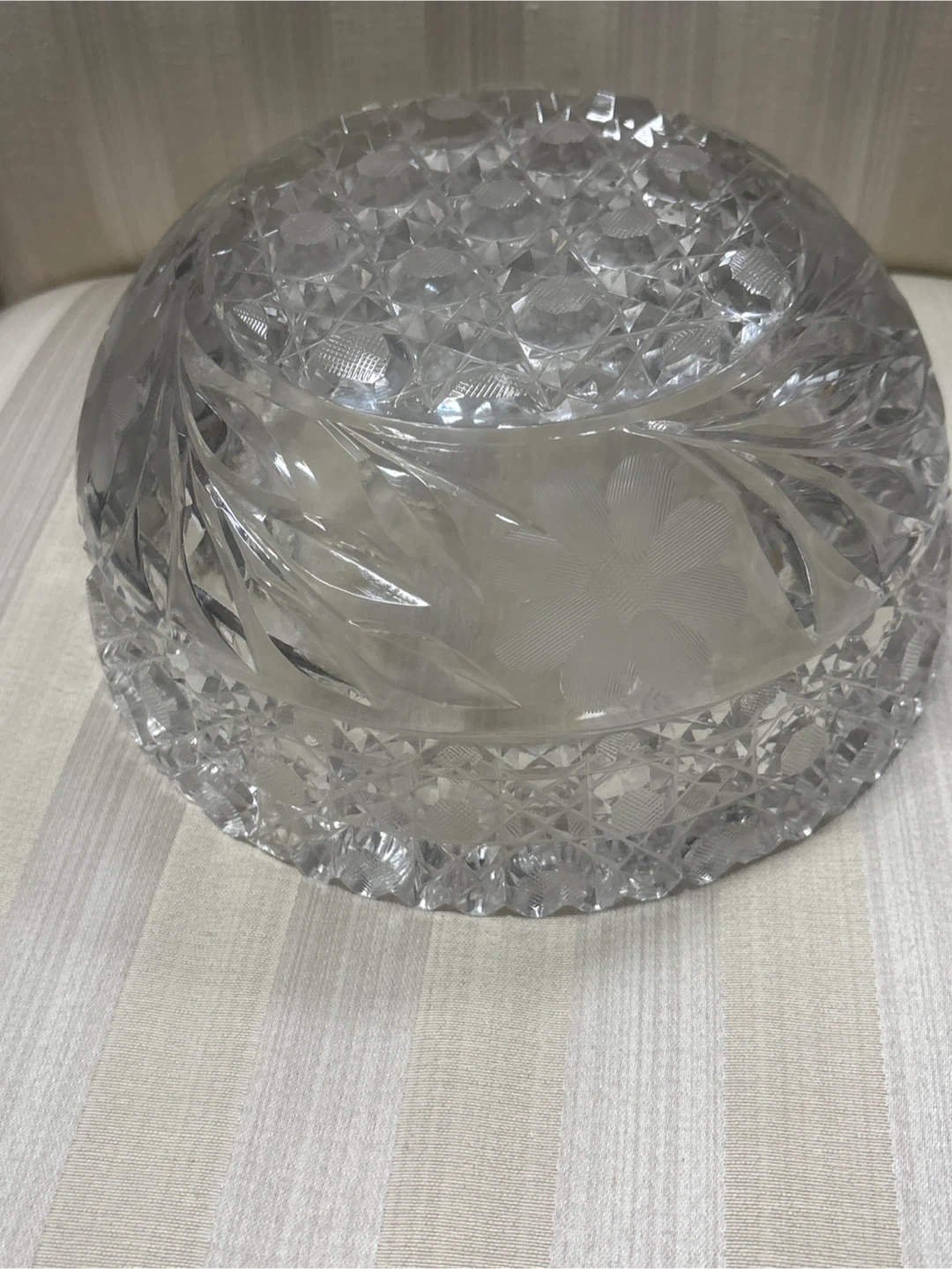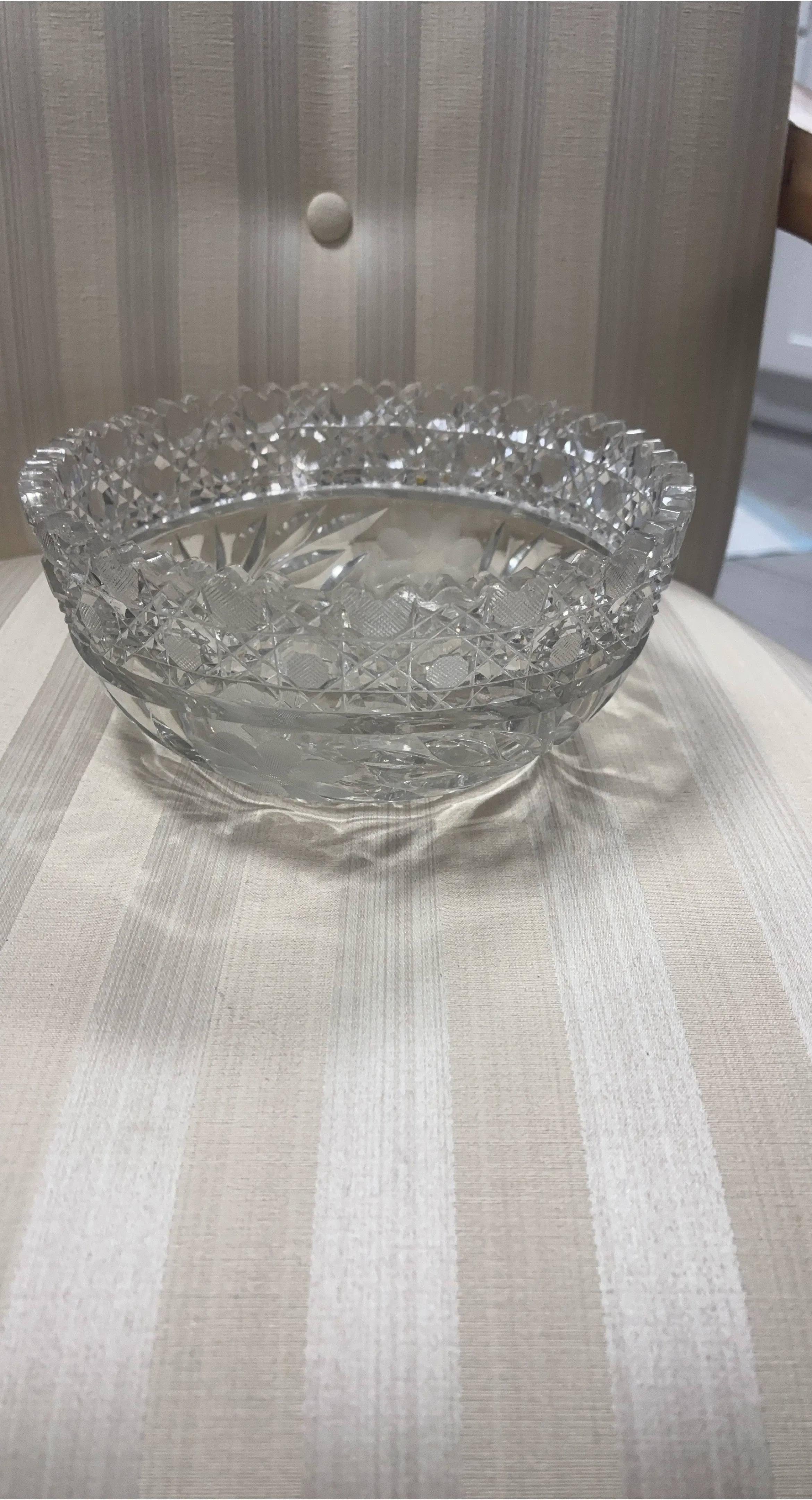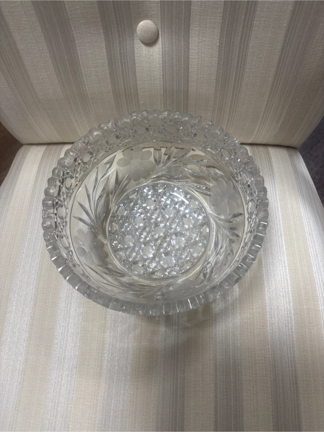 Beautiful vintage crystal bowl. Features intricate cut glass patterns and a delicate floral etching. It's a lovely piece for serving or display!