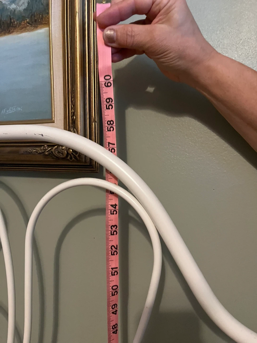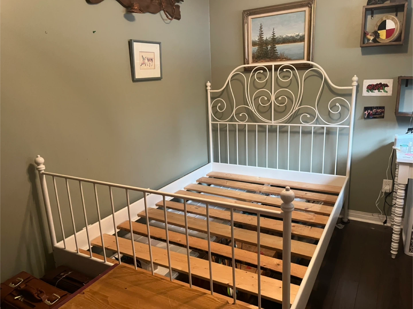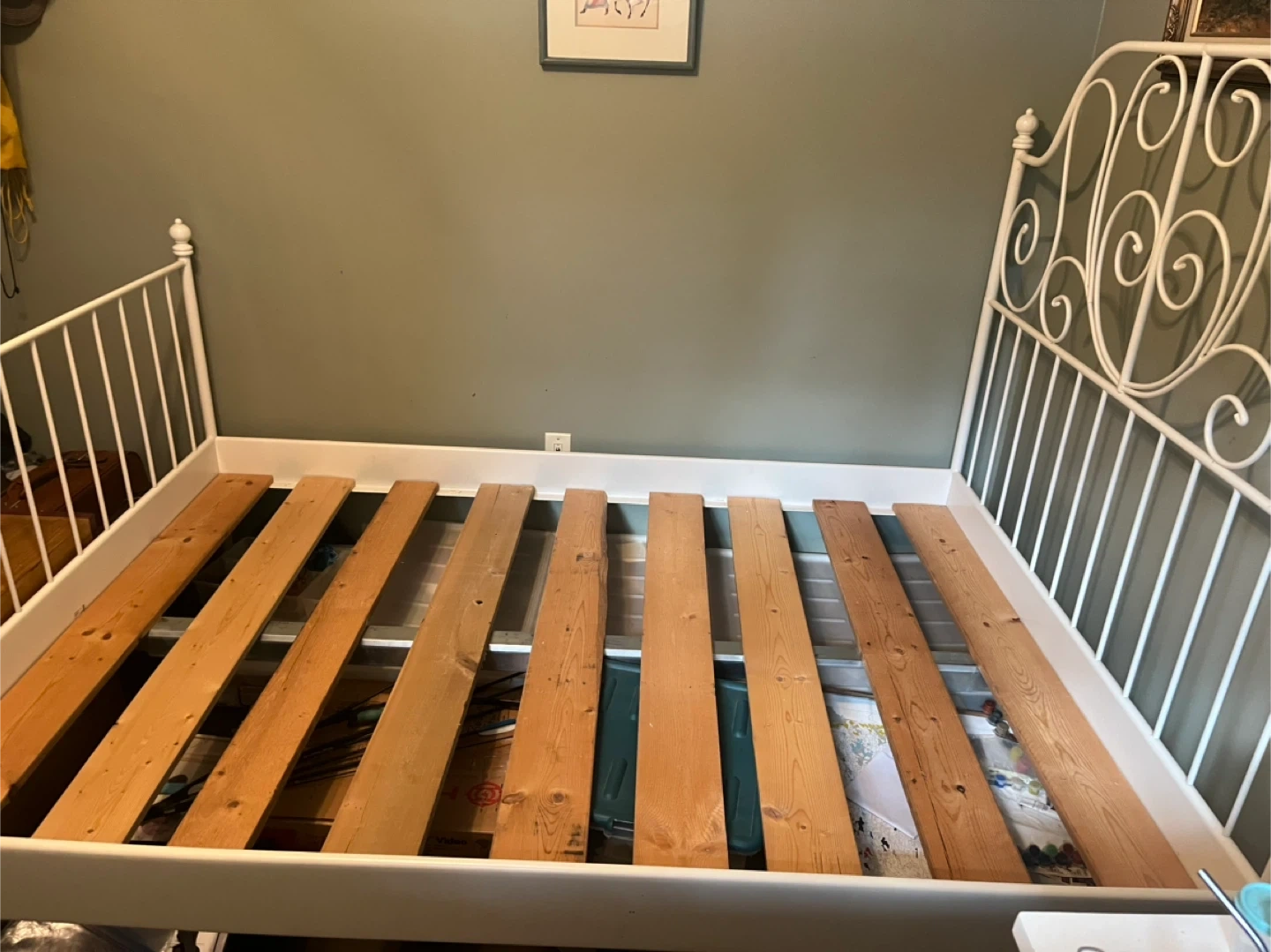 The frame is like new. It’s 53 1/2 inches wide. Headboard is 58 inches tall and the end board is 39 inches tall. There is 12.5 inches of clearance under the bed.