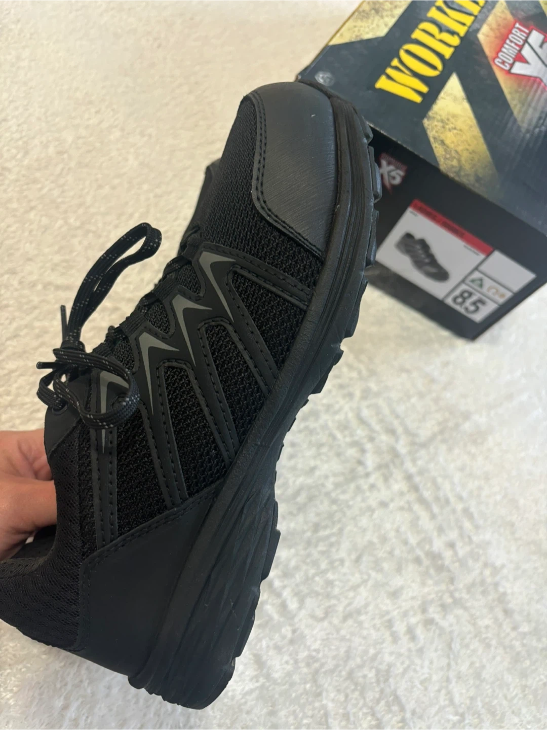These black Workload Comfort X5 safety shoes are a ladies size 8.5. They feature a wide fit aluminum toe and a breathable lining. The shoes also include shock absorbing insoles and anti-fatigue support.