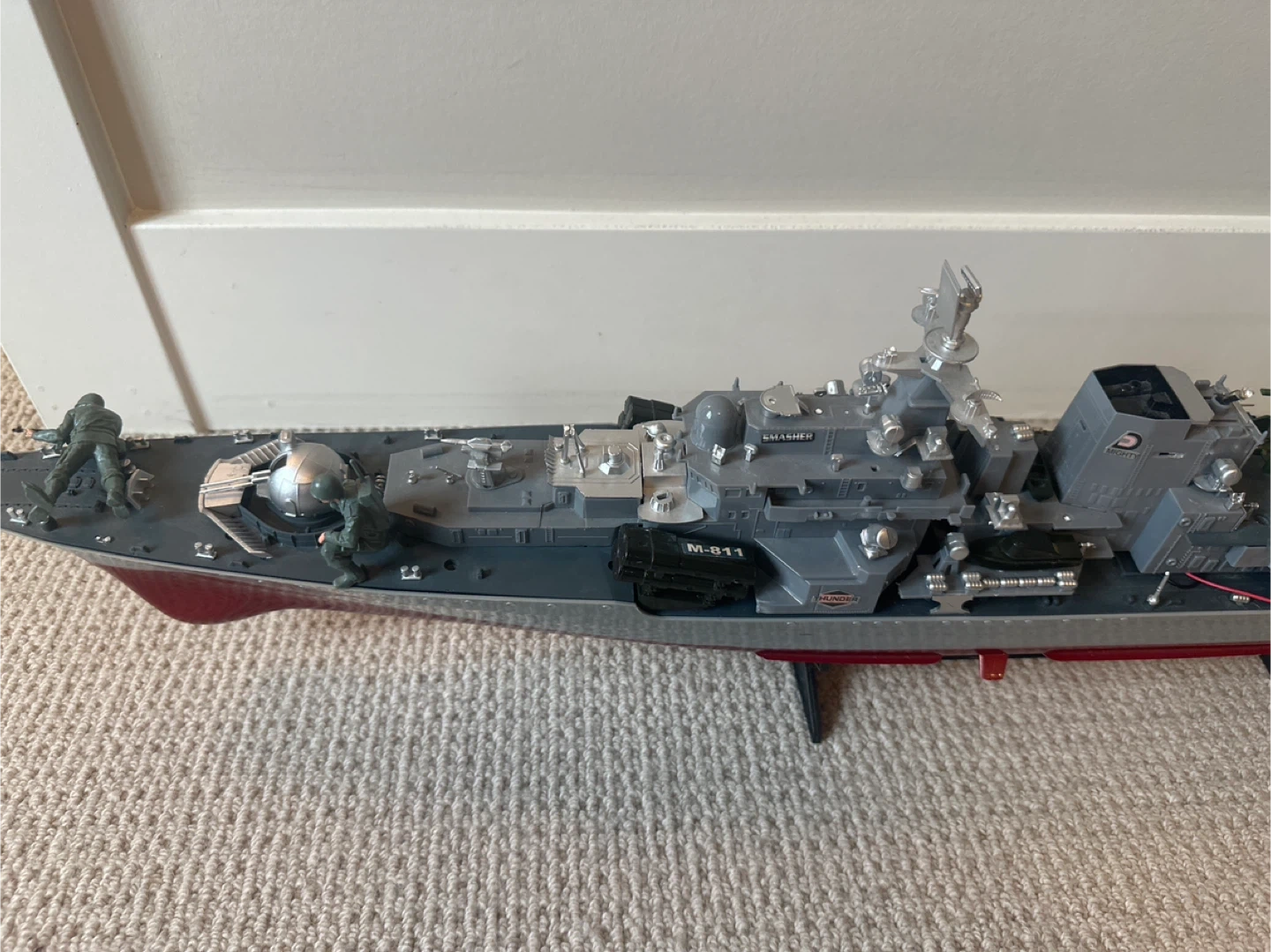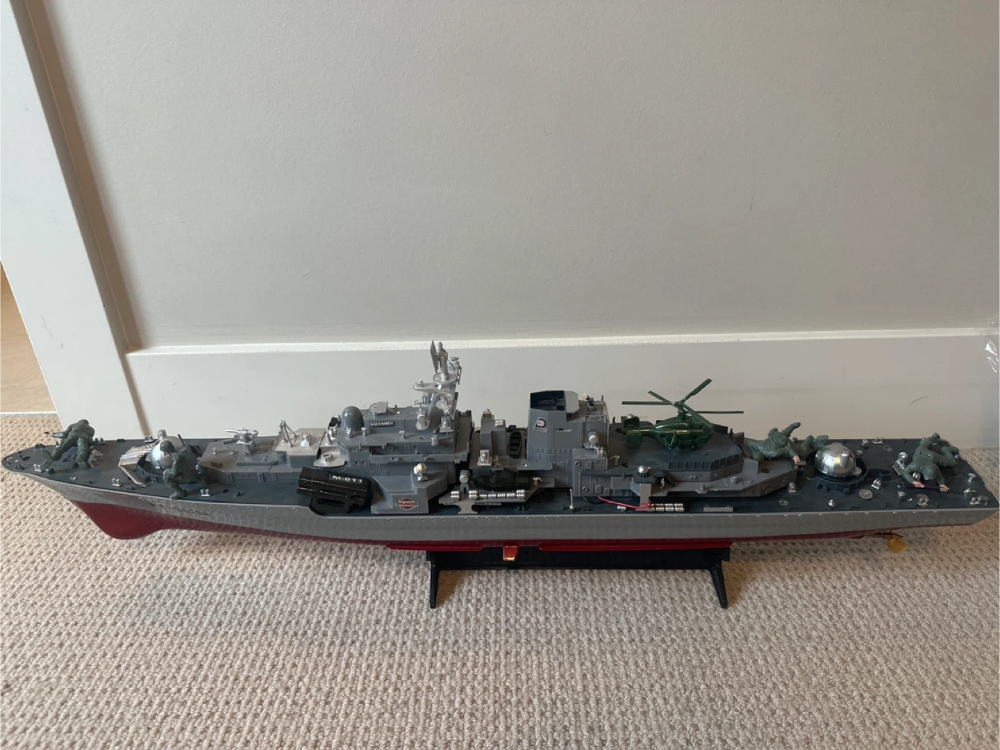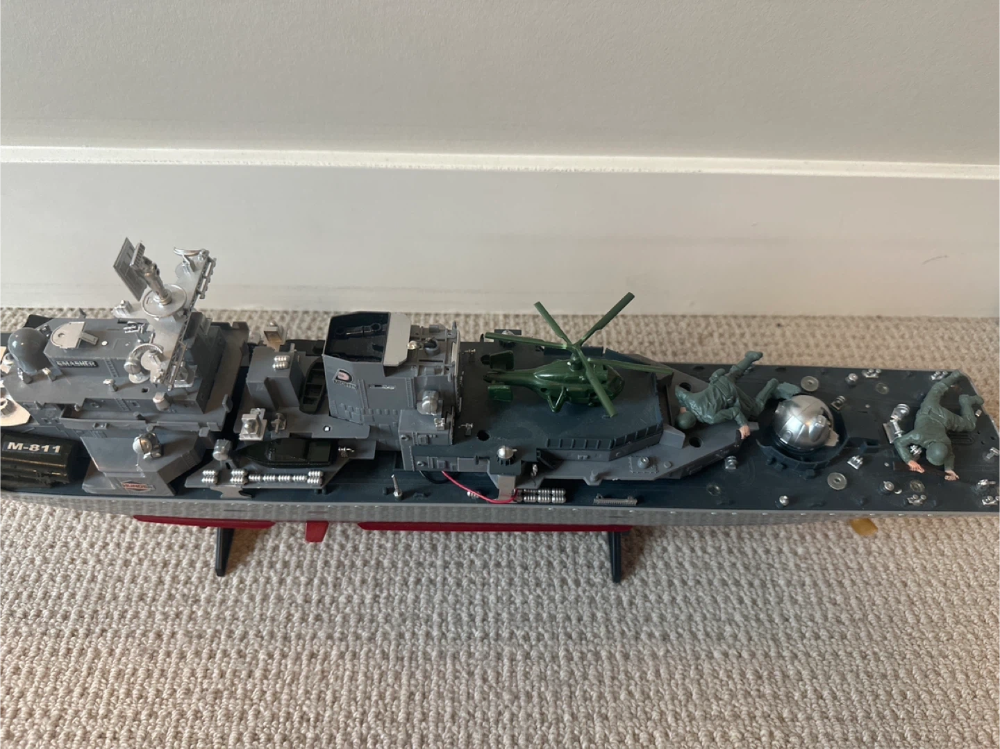 This is a detailed model of the M-811 warship, complete with a green helicopter and several small figures. It's mounted on a display stand. This model is great for collectors or as a display piece!